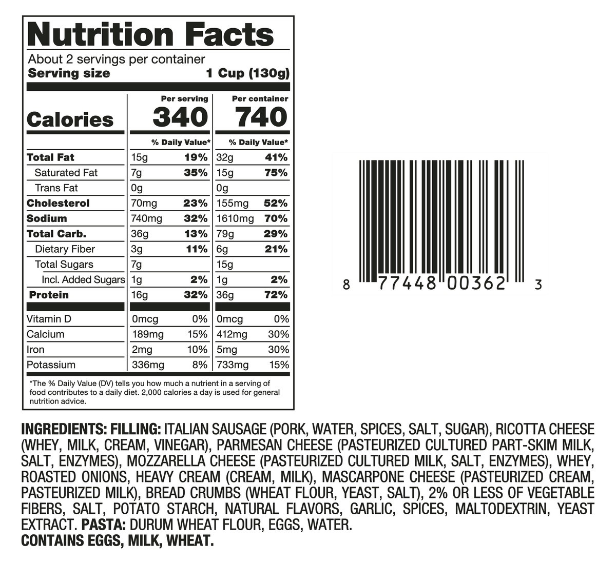 FILLING: ITALIAN SAUSAGE (PORK, WATER, SPICES, SALT, SUGAR), RICOTTA CHEESE (WHEY, MILK, CREAM, VINEGAR), PARMESAN CHEESE (PASTEURIZED CULTURED PART-SKIM MILK, SALT, ENZYMES), MOZZARELLA CHEESE (PASTE…