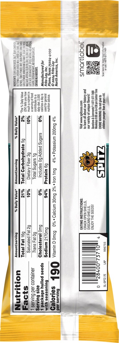 Sunflower Seeds, Salt, Sunflower Oil, Buttermilk, Cheddar Cheese (Milk, Cheese Cultures, Salt, Enzymes), Tomato Powder, Whey, Onion Powder, Corn Starch, Garlic Powder, Monosodium Glutamate, Sugar, Dex…