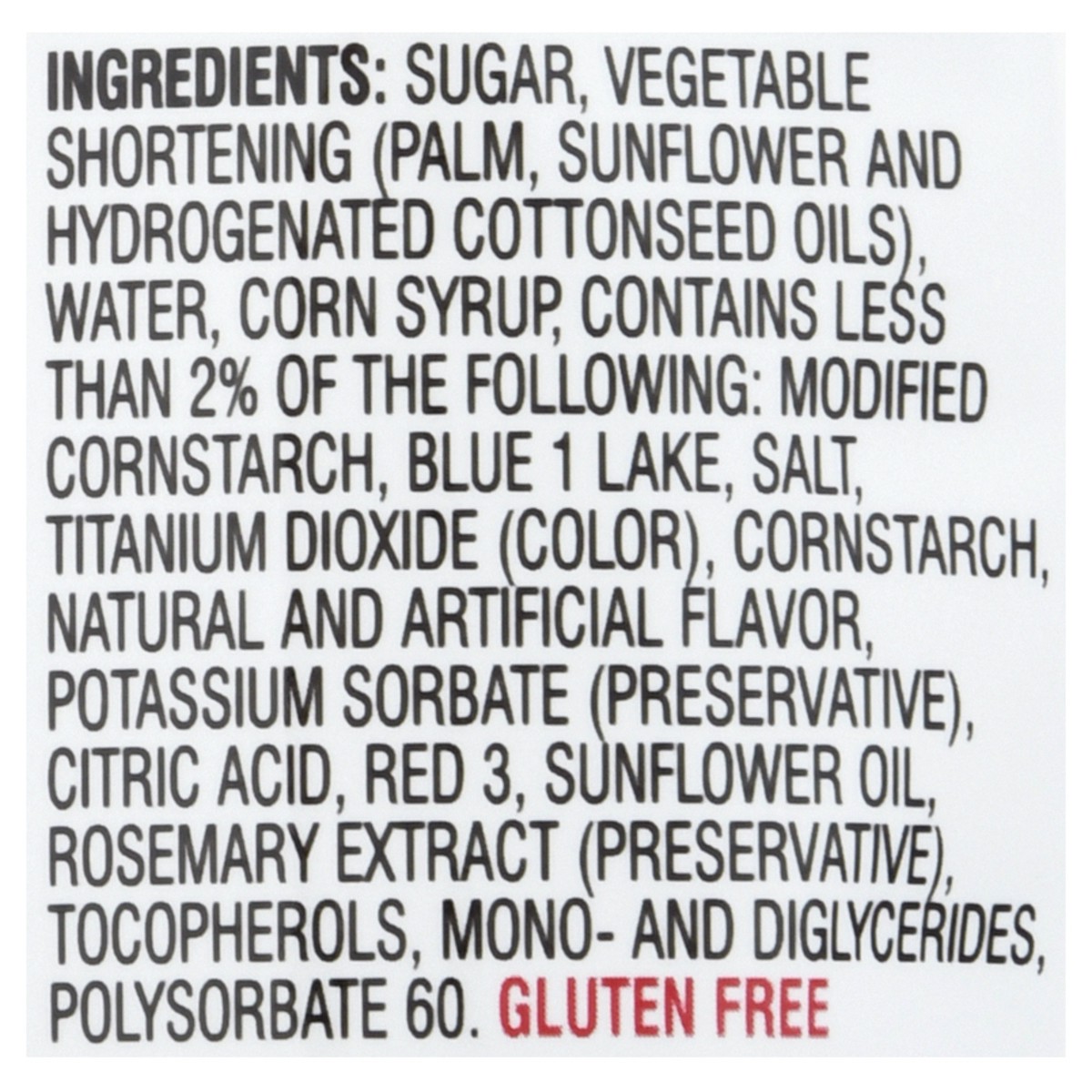Sugar, Vegetable Shortening (Palm, Sunflower and Hydrogenated Cottonseed Oils), Water, Corn Syrup, Contains Less than 2% of the Following: Modified Cornstarch, Blue 1 Lake, Salt, Titanium Dioxide (Col…