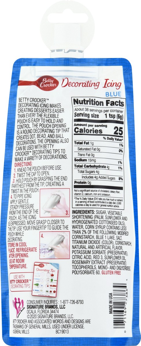 Gluten free. Taste delicious! Perfect for piping cake borders and designs. Betty Crocker Decorating Icing makes creating desserts easier than ever! The flexible pouch is easy to hold and control the p…