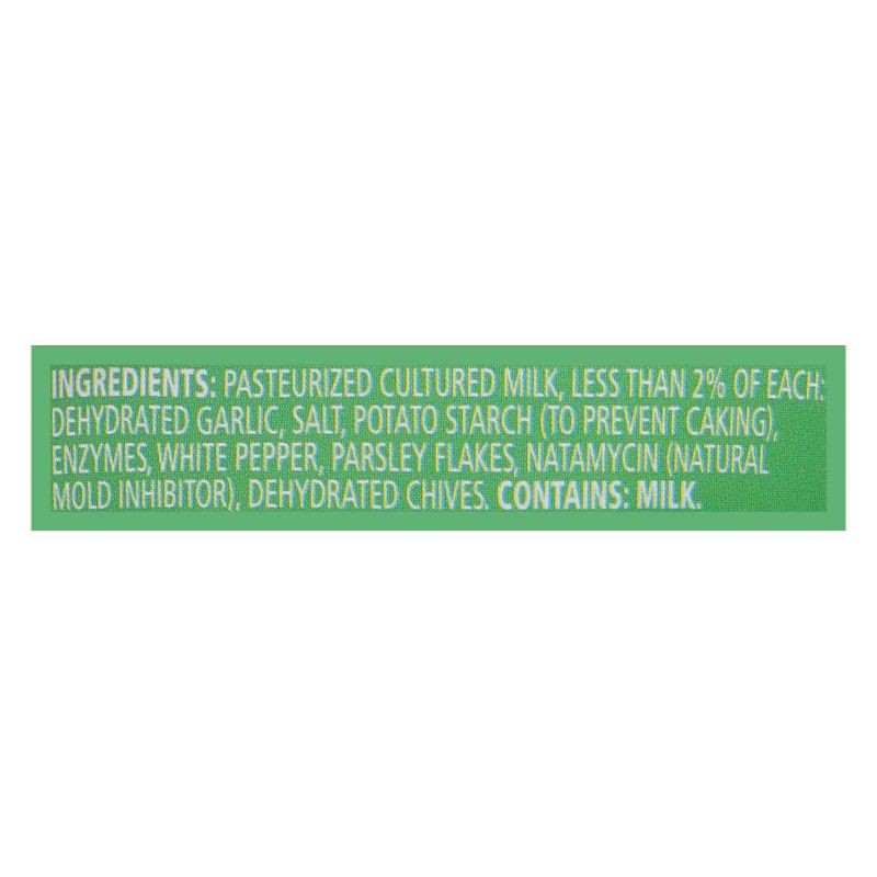 Pasteurized Cultured Milk, Less Than 2% of Each Dehydrated Garlic, Salt, Potato Starch (To Prevent Caking) Enzymes, White Pepper, Parsley Flakes, Natamycin (Natural Mold Inhibitor), Dehydrated Chives