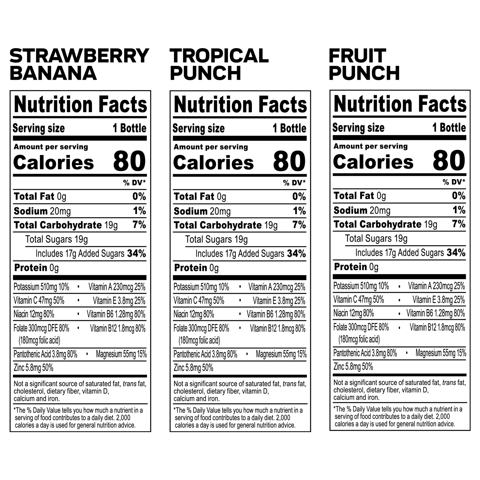 Strawberry Banana: Filtered Water, Cane Sugar, Coconut Water Concentrate, Citric Acid, Electrolyte Blend (Dipotassium Phosphate, Magnesium Oxide, Zinc Oxide), Fruit and Vegetable Juice (Color), Vitami…