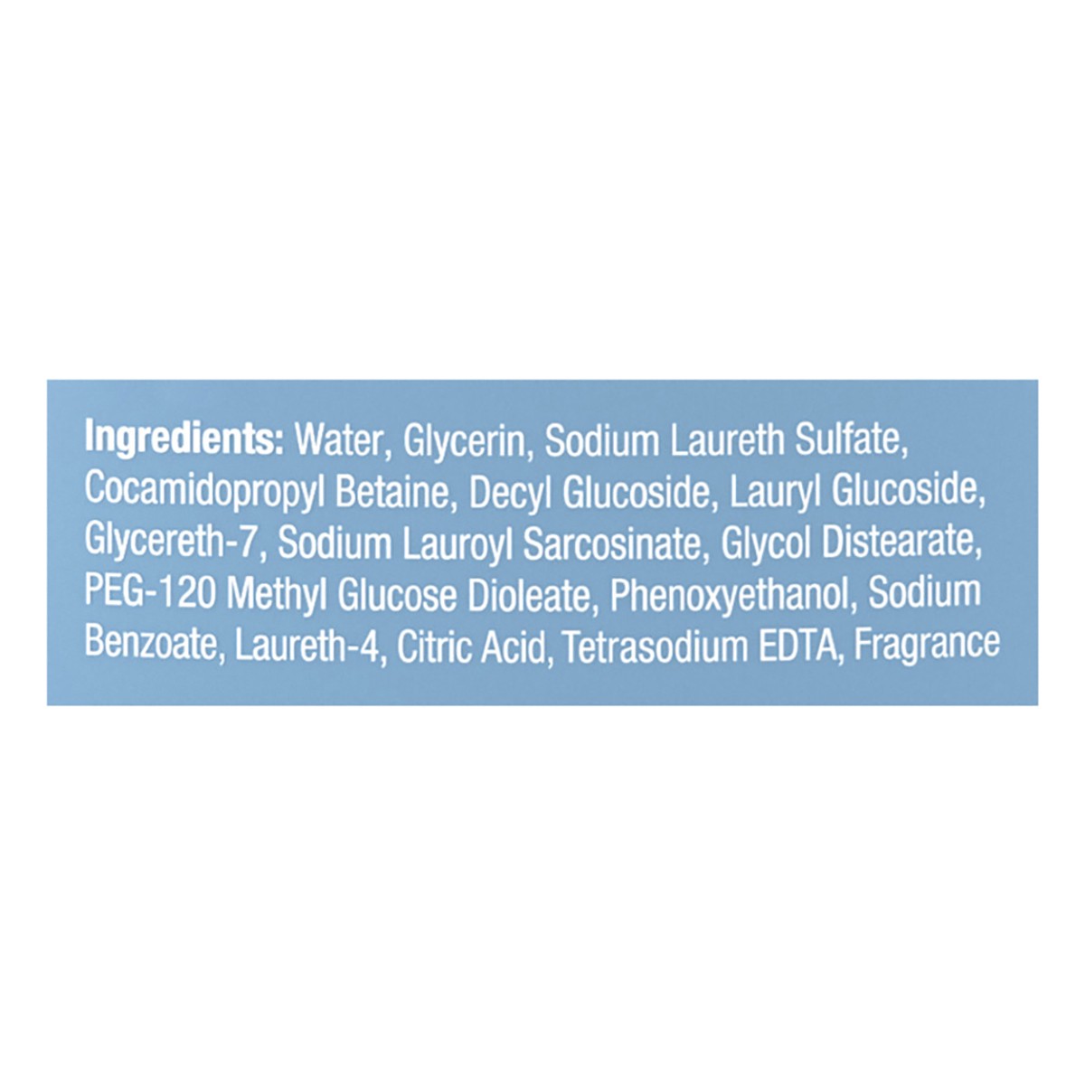 Water, Glycerin, Sodium Laureth Sulfate, Cocamidopropyl Betaine, Decyl Glucoside, Lauryl Glucoside, Glycereth-7, Sodium Lauroyl Sarcosinate, Glycol Distearate, PEG-120 Methyl Glucose Dioleate, Phenoxy…