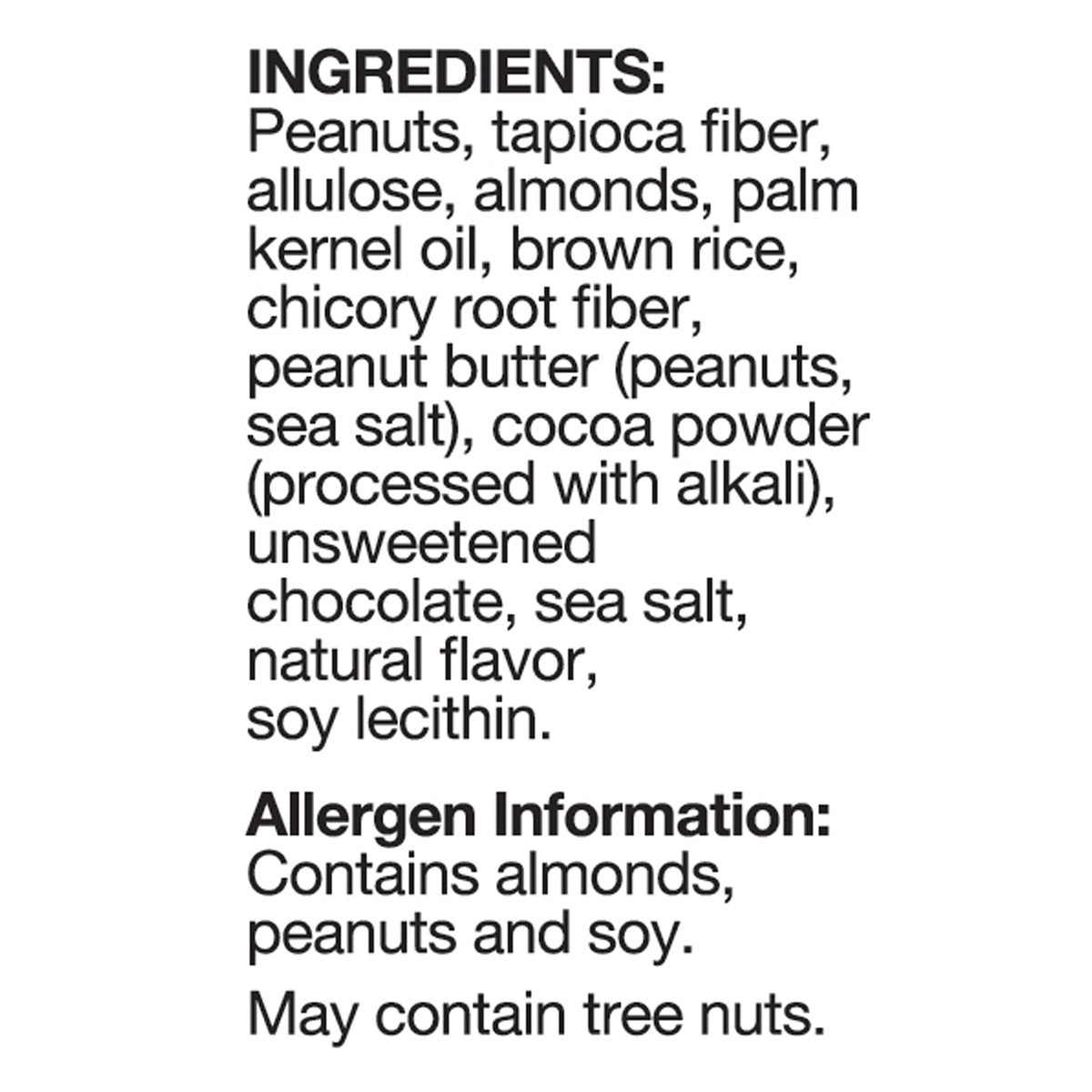 Peanuts, Tapioca Fiber, Allulose, Almonds, Palm Kernel Oil, Brown Rice, Chicory Root Fiber, Peanut Butter (Peanuts, Sea Salt), Cocoa Powder (Processed with Alkali), Unsweetened Chocolate, Sea Salt, Na…