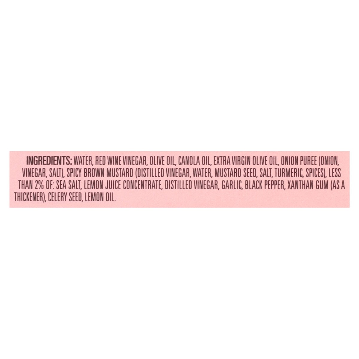 Water, Red Wine Vinegar, Olive Oil, Canola Oil, Extra Virgin Olive Oil, Onion Puree (Onion, Vinegar, Salt), Spicy Brown Mustard (Distilled Vinegar, Water, Mustard Seed, Salt, Turmeric, Spices), Less t…