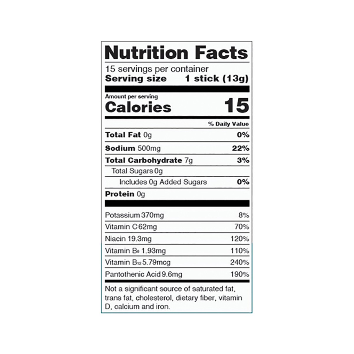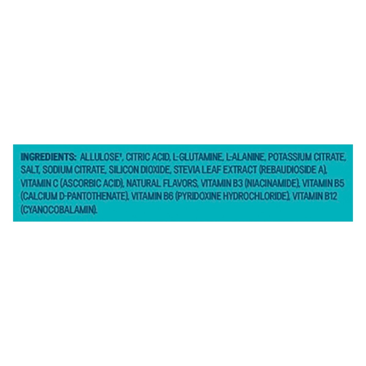 Allulose (a), Citric Acid, L-Glutamine, L-Alanine, Potassium Citrate, Salt, Sodium Citrate, Silicon Dioxide, Stevia Leaf Extract (Rebaudioside A), Vitamin C (Ascorbic Acid), Natural Flavors, Vitamin B…
