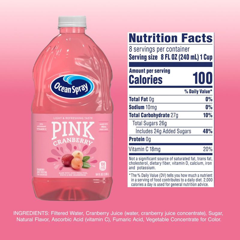 Pink. Light. Radically refreshing. Quench your thirst with Ocean Spray Pink Cranberry Juice Cocktail. This crisp, flavorful drink is made from real fruit juice concentrate from pink, white and red cra…
