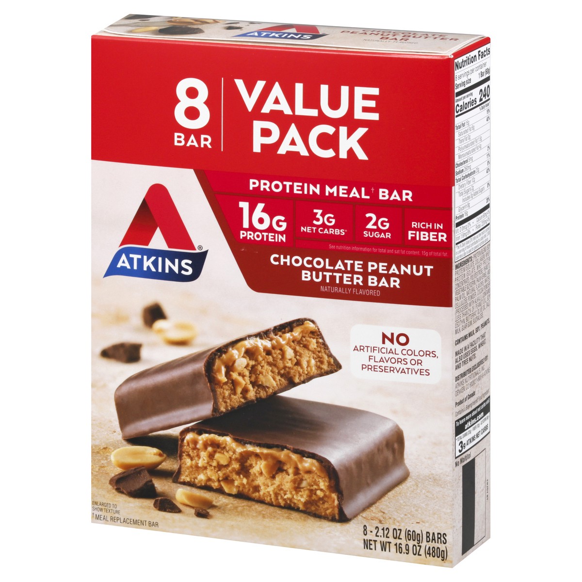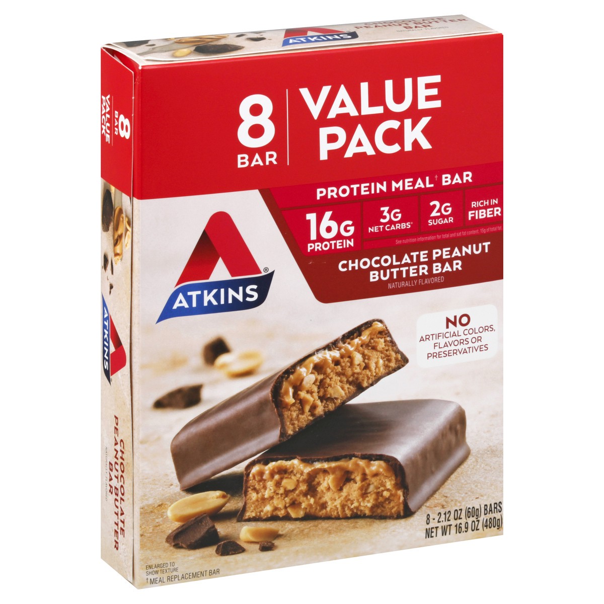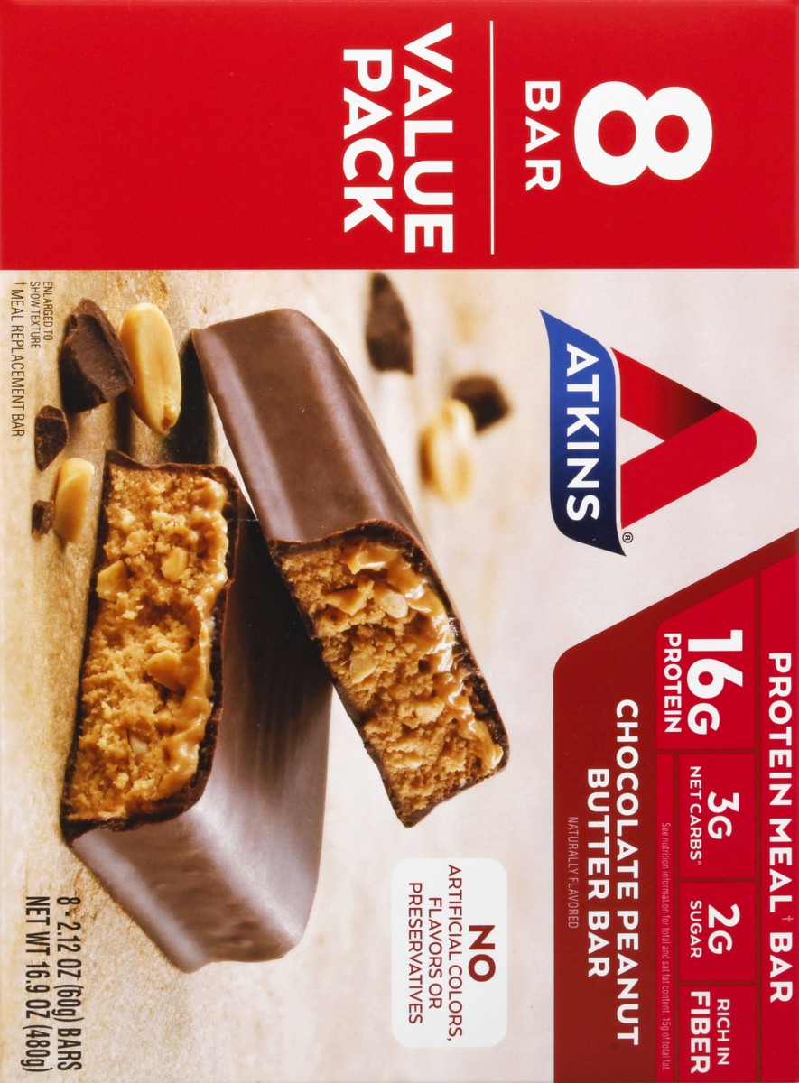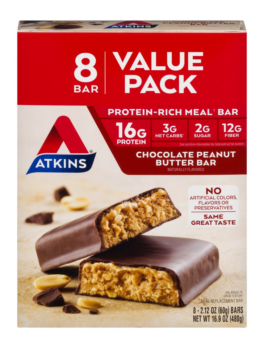 - AT HOME OR ON-THE-GO. Atkins Chocolate Peanut Butter Protein Meal Bars. Enjoy delicious meal bars that fit right into your busy schedule