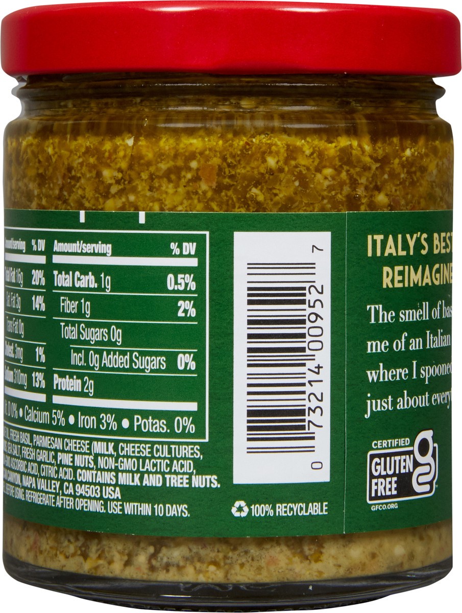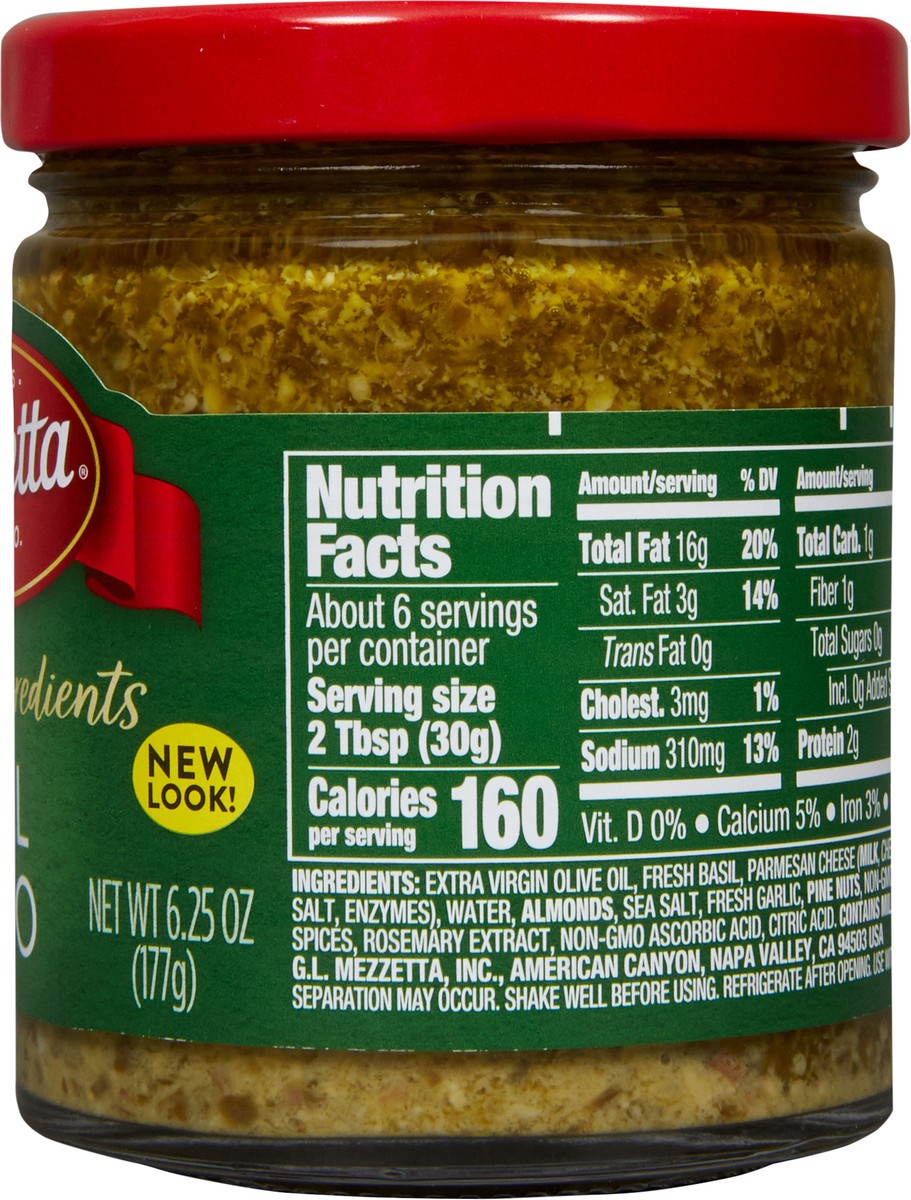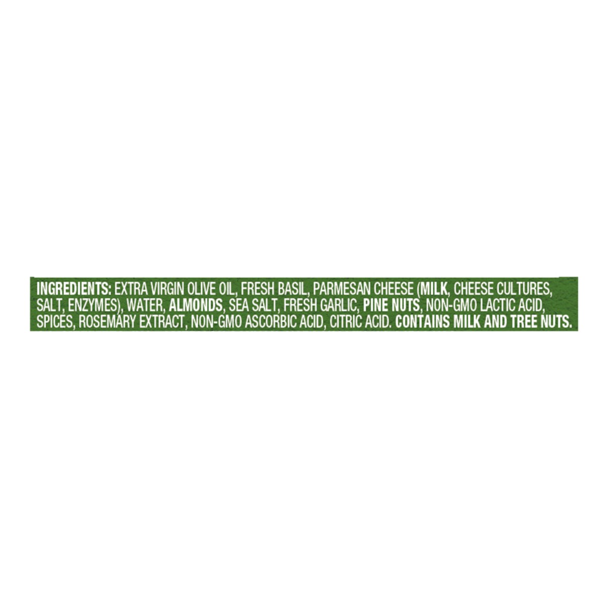 Extra Virgin Olive Oil, Fresh Basil, Parmesan Cheese (Milk, Cheese Cultures, Salt Enzymes), Water, Almonds, Sea Salt, Fresh Garlic, Pine Nuts, Non-GMO Lactic Acid, Spices, Rosemary Extract, Non-GMO As…