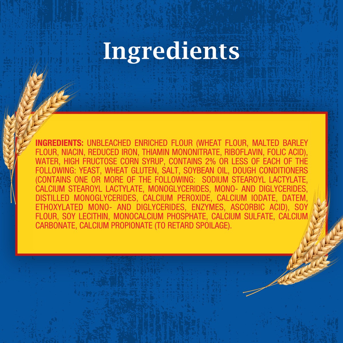 Unbleached Enriched Flour (Wheat Flour, Malted Barley Flour, Niacin, Reduced Iron, Thiamin Mononitrate, Riboflavin, Folic Acid), Water, High Fructose Corn Syrup, Contains 2% or Less of Each of the Fol…