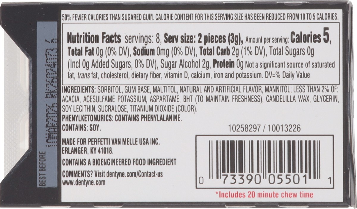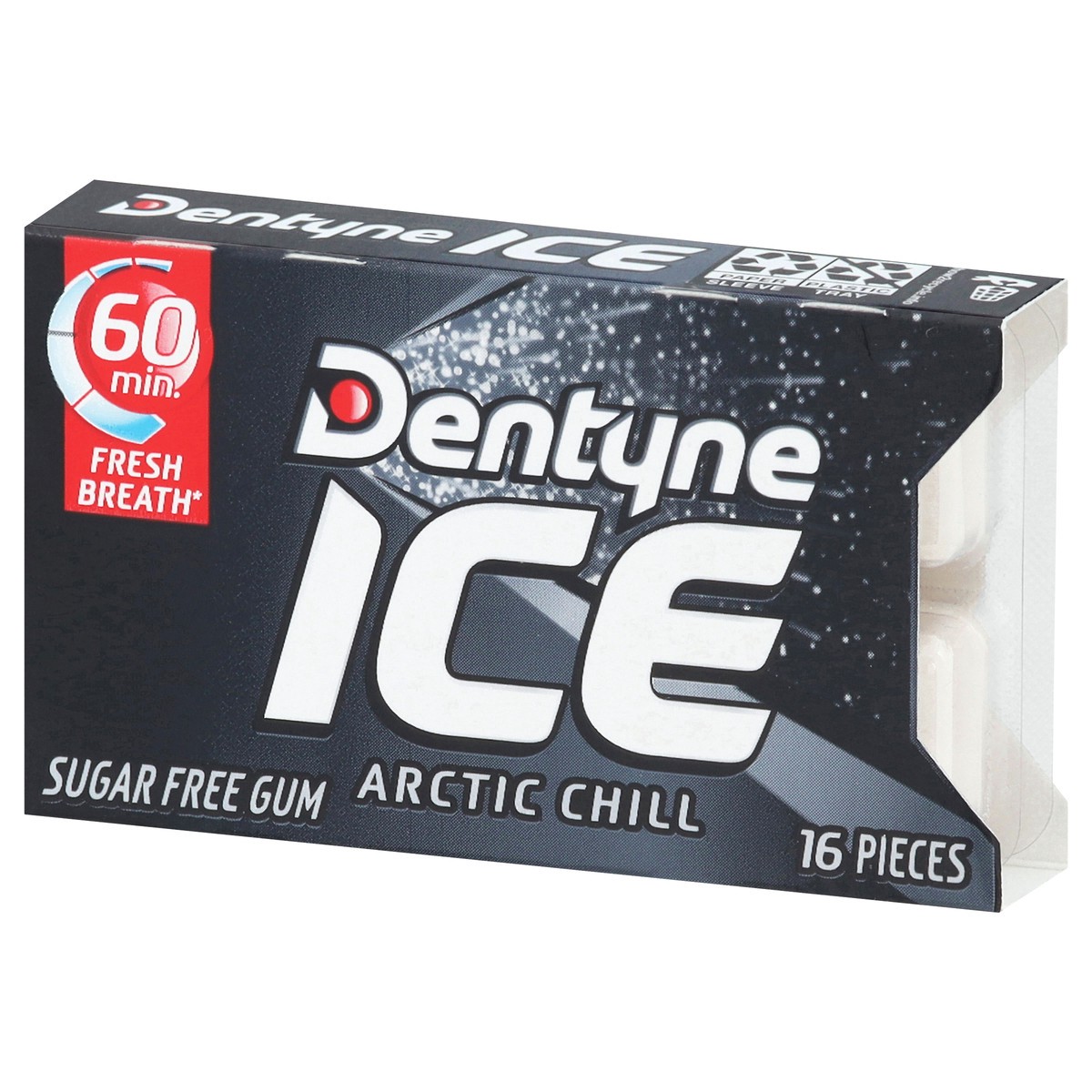 Dentyne Ice Arctic Chill Sugar Free Gum freshens your breath for up to 60 minutes, including 20 minutes of chew time. These small cubes of sugar free chewing gum have 35% fewer calories than sugared g…