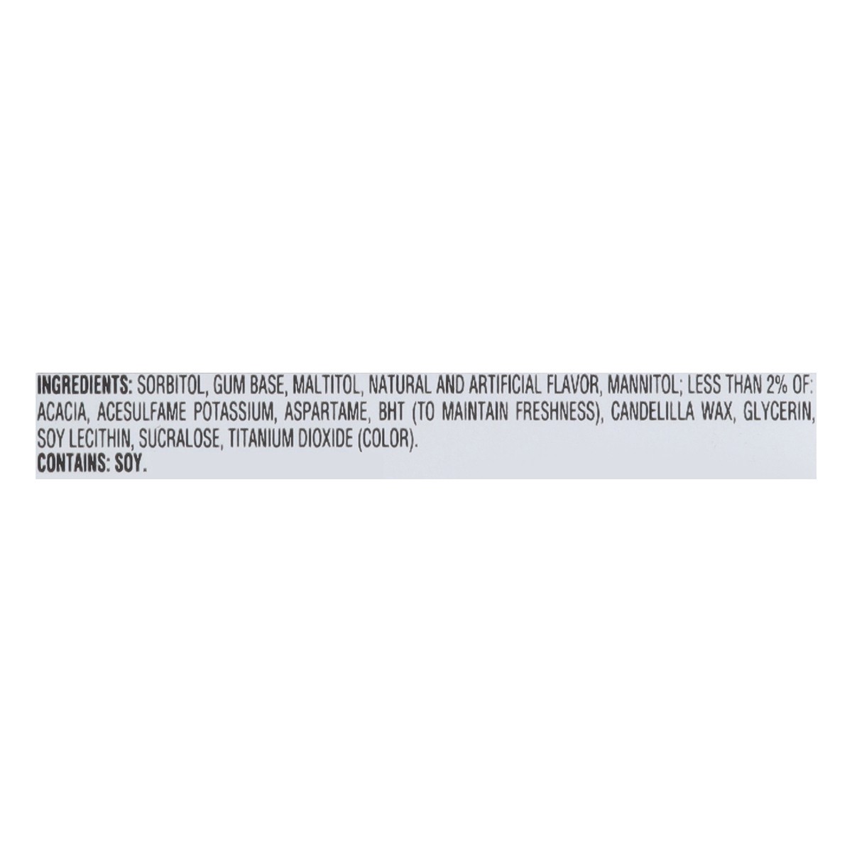 Sorbitol, Gum Base, Maltitol, Mannitol, Artificial And Natural Flavoring; Less Than 2% Of: Acacia, Acesulfame Potassium, Aspartame, BHT (To Maintain Freshess), Candelilla Wax, Glycerin, Soy Lecithin, …