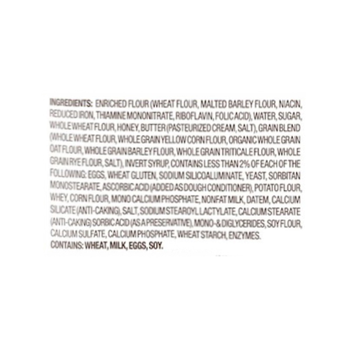Enriched Flour (Wheat Flour, Malted Barley Flour, Niacin, Reduced Iron, Thiamine Mononitrate, Riboflavin, Folic Acid), Water, Sugar, Whole Wheat Flour, Honey, Butter (Pasteurized Cream, Salt), Grain B…