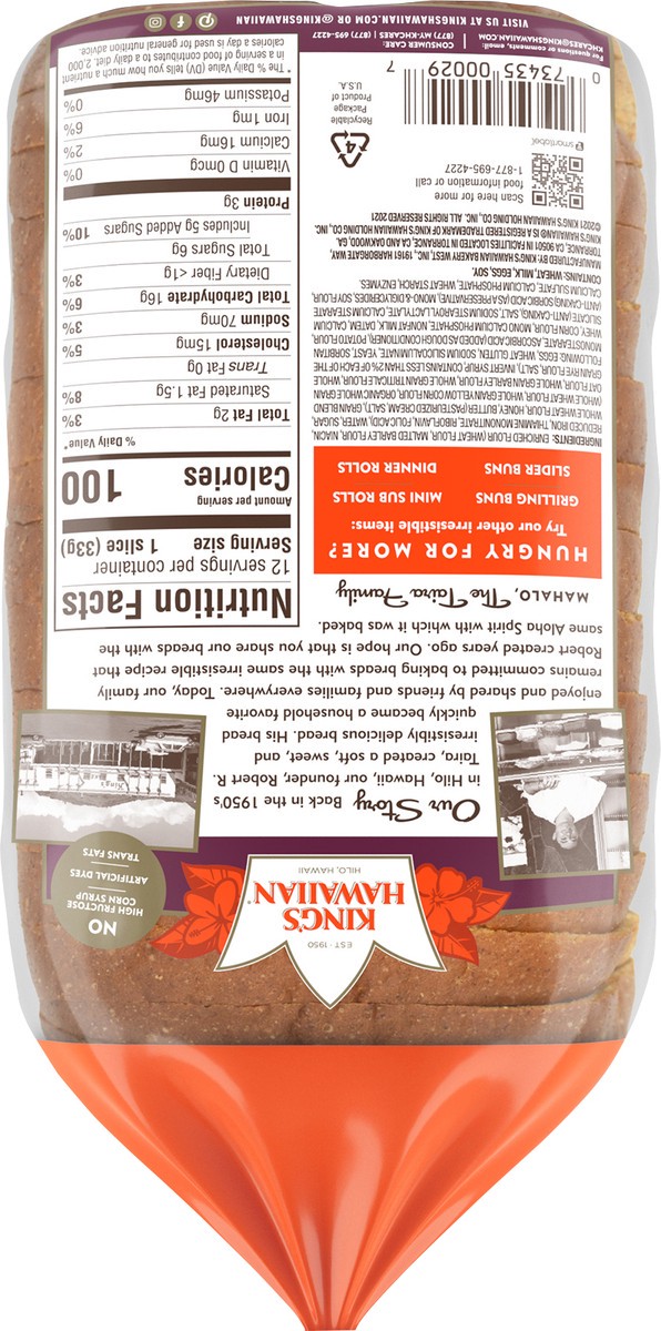 King's Hawaiian Honey Wheat Hawaiian Sliced Bread - 13.5 Oz