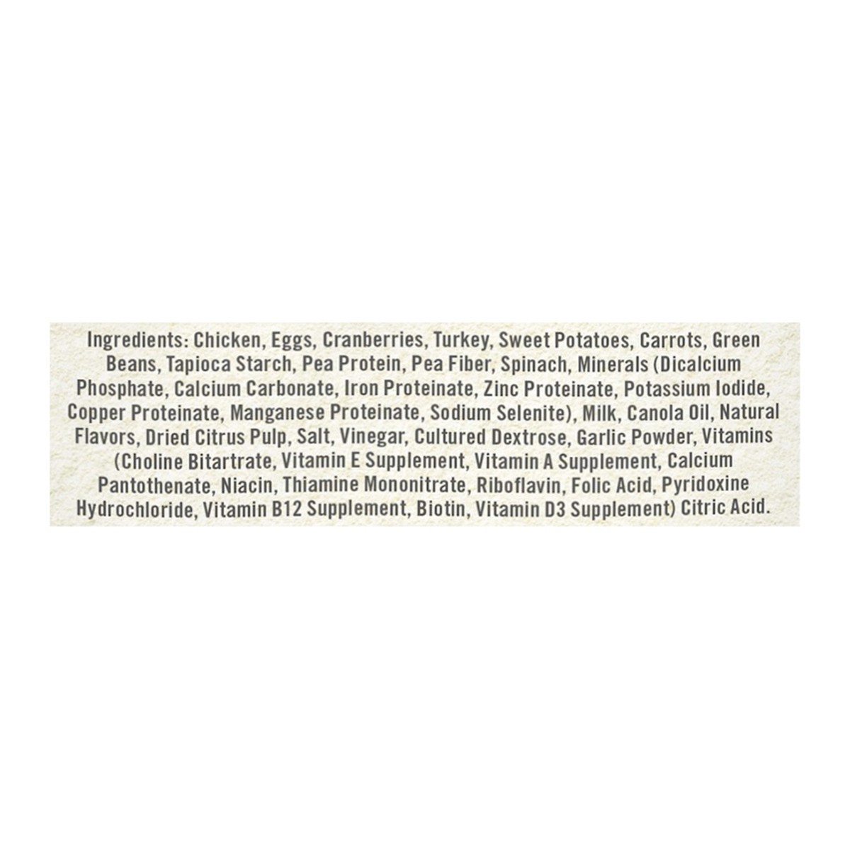 Chicken, Eggs, Cranberries, Turkey, Sweet Potatoes, Carrots, Green Beans, Tapioca Starch, Pea Protein, Pea Fiber, Spinach, Minerals (Dicalcium Phosphate, Calcium Carbonate, Iron Proteinate, Zinc Prote…