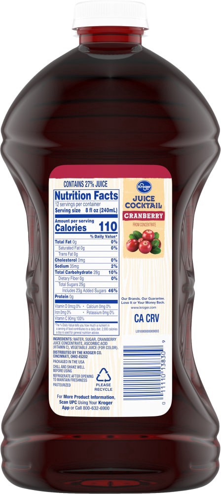 Kroger® Cranberry Juice Cocktail bubbles with tangy fun, and delicious cranberry flavor. With water, sugar, and cranberry juice concentrate, this is a beverage you're going to love. With added vitamin…