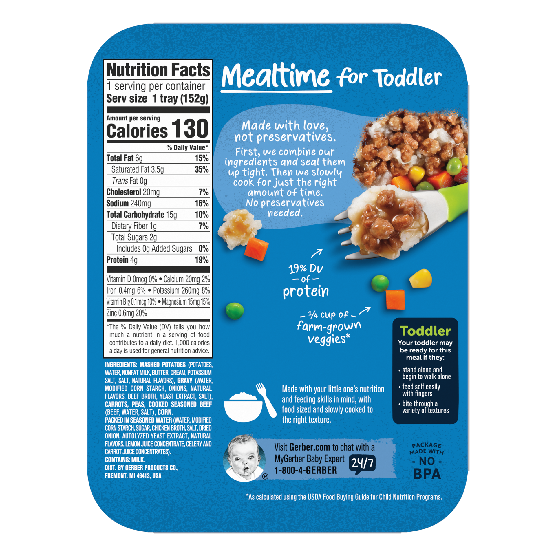 Your toddler will enjoy Gerber''s Mashed Potatoes & Seasoned Beef in Gravy with a side of carrots, peas and corn. First, we combine our ingredients and seal them up tight. Then we slowly cook for just…