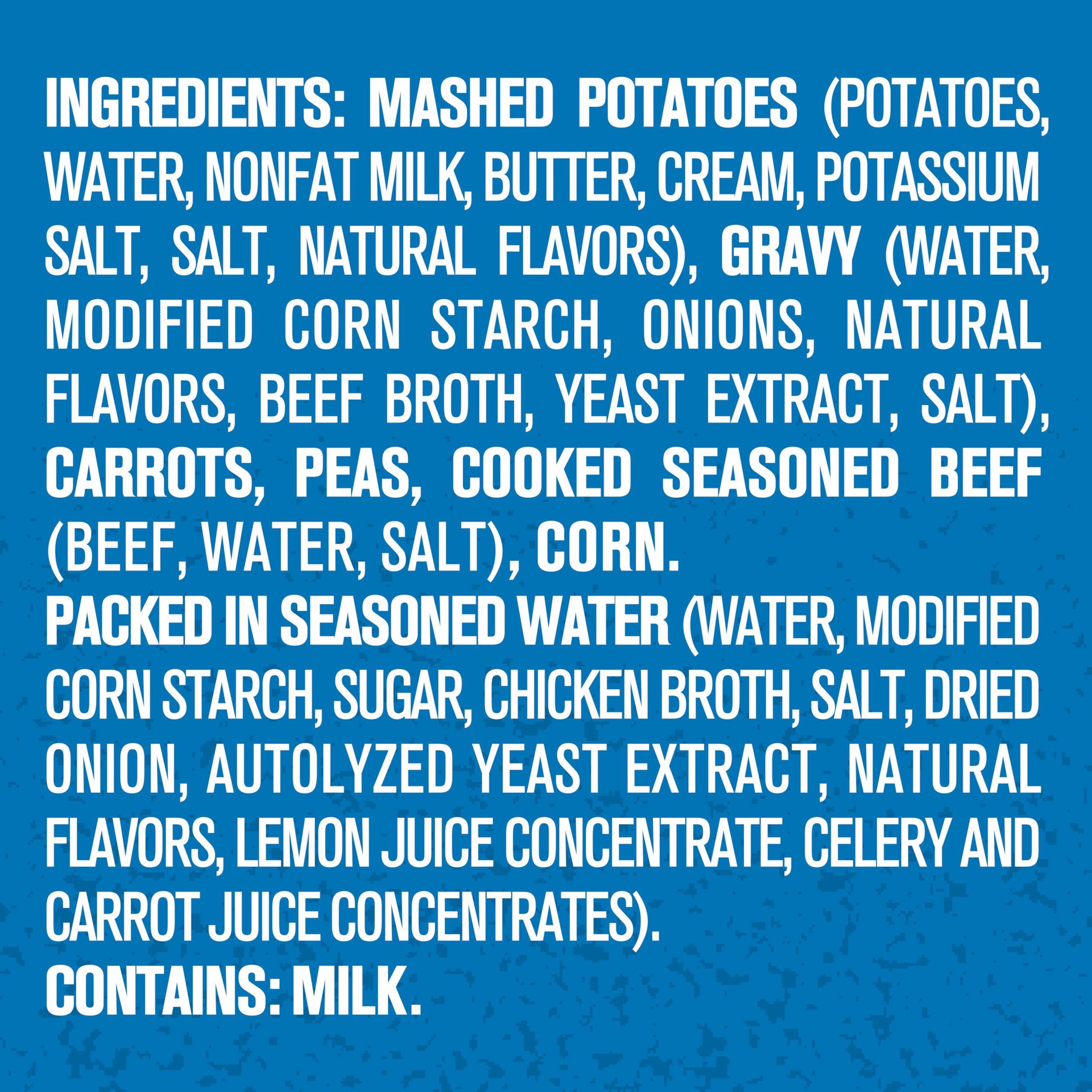Mashed Potatoes (Potatoes, Water, Nonfat Milk, Butter, Cream, Potassium Salt, Salt, Natural Flavors), Gravy (Water, Corn Starch, Onions, Beef Broth, Natural Flavors, Salt, Vegetable Juice Concentrates…