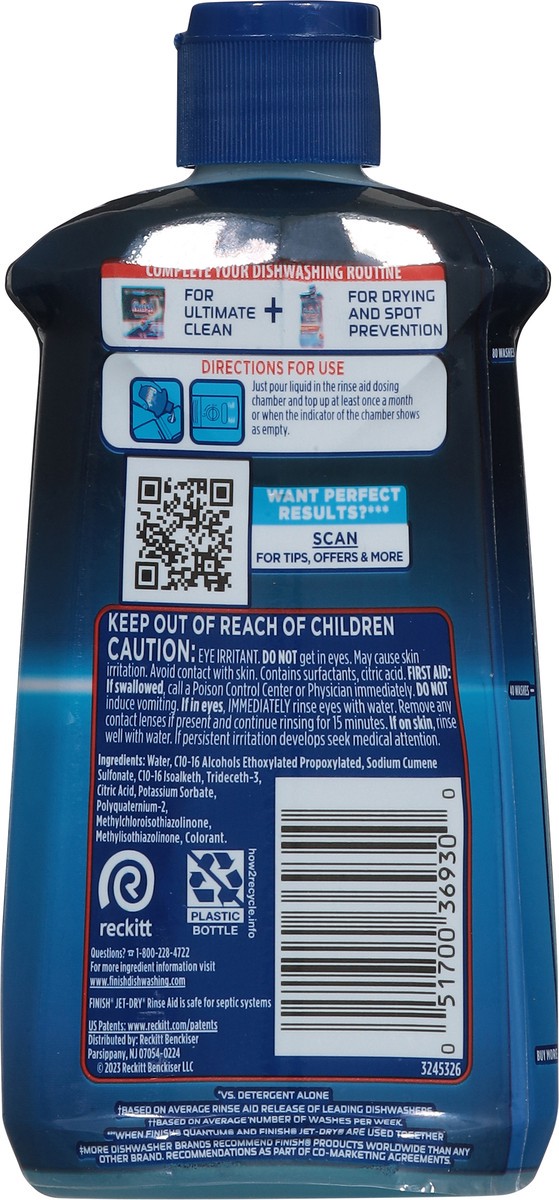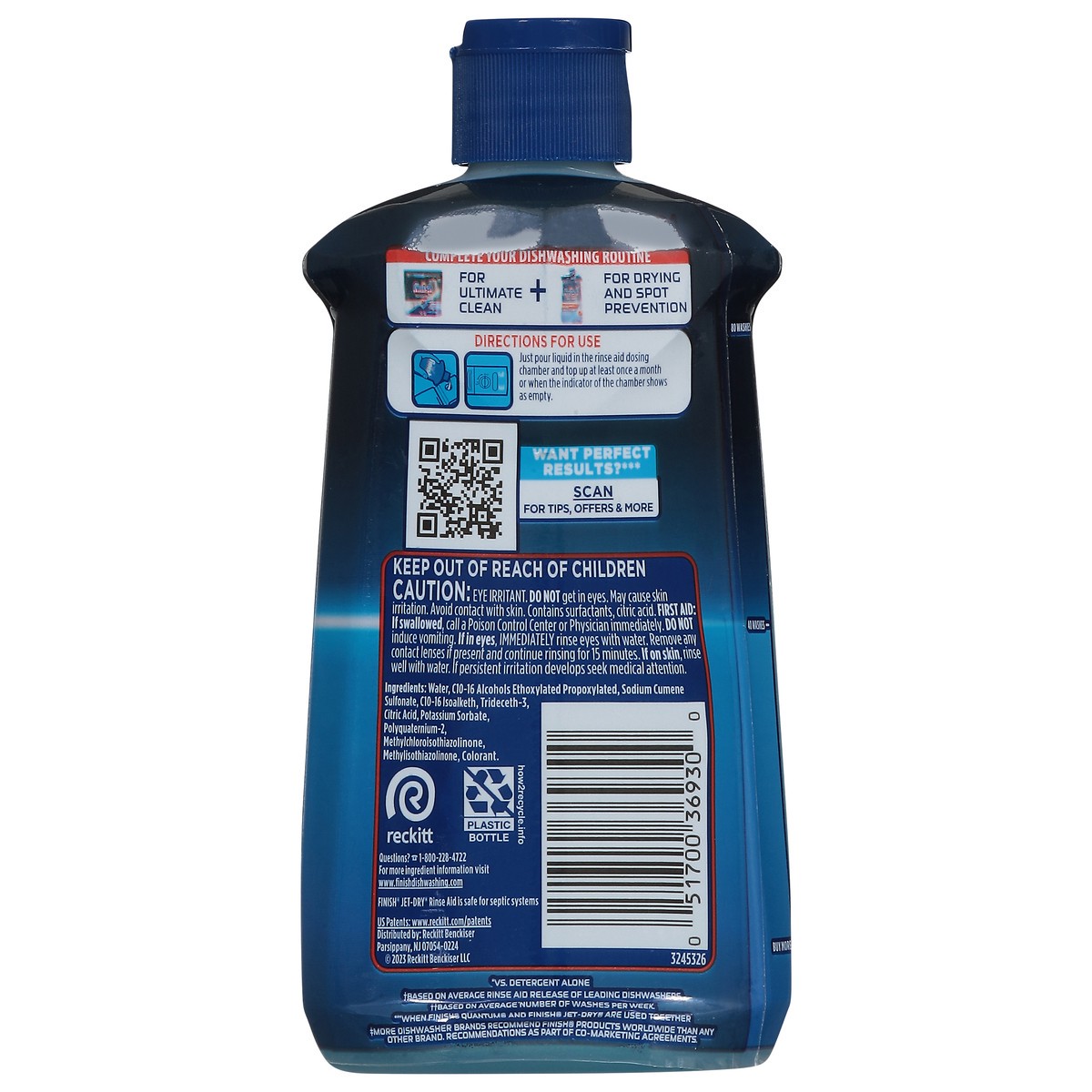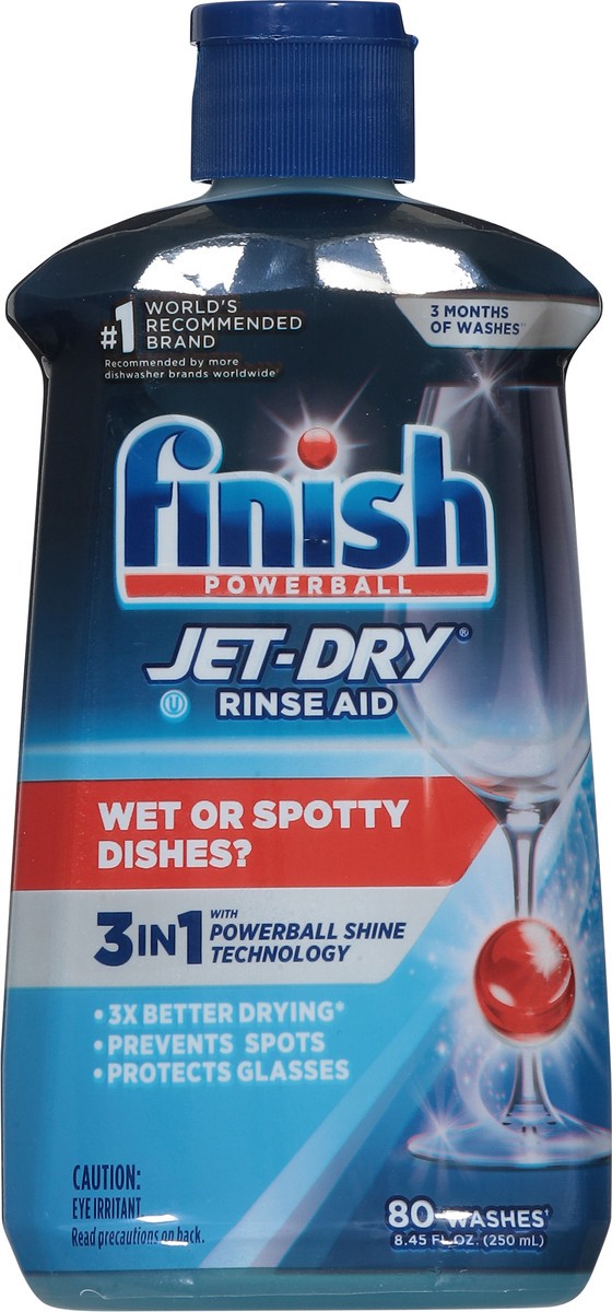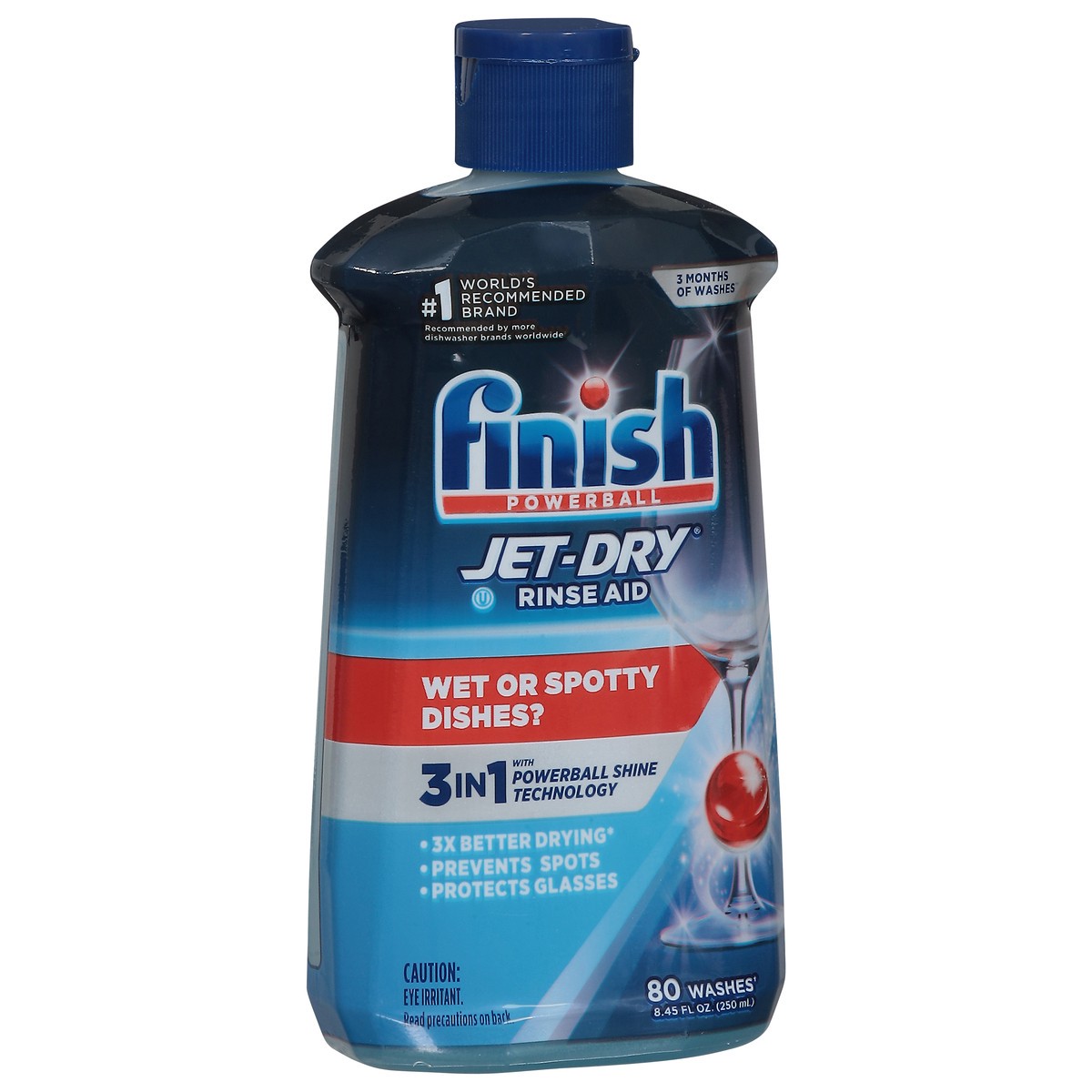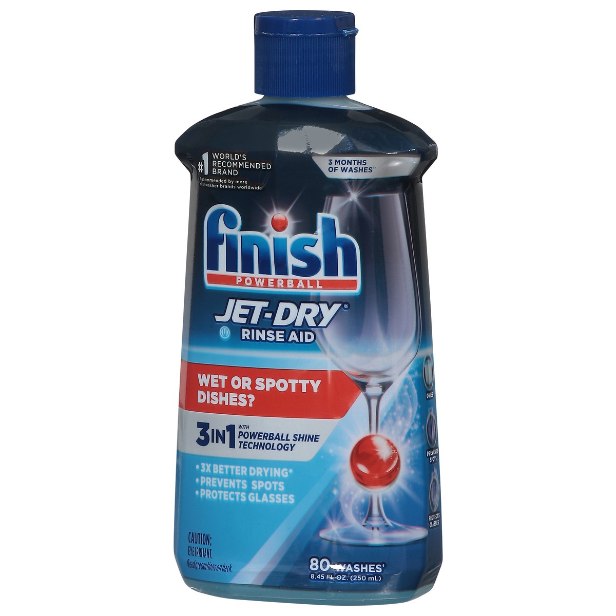 Experience shiny dishes and spot and film protection with Finish Jet-Dry Rinse Aid. This powerful rinse aid works with your dishwasher detergent to rinse away stubborn leftover food, spots, and film f…