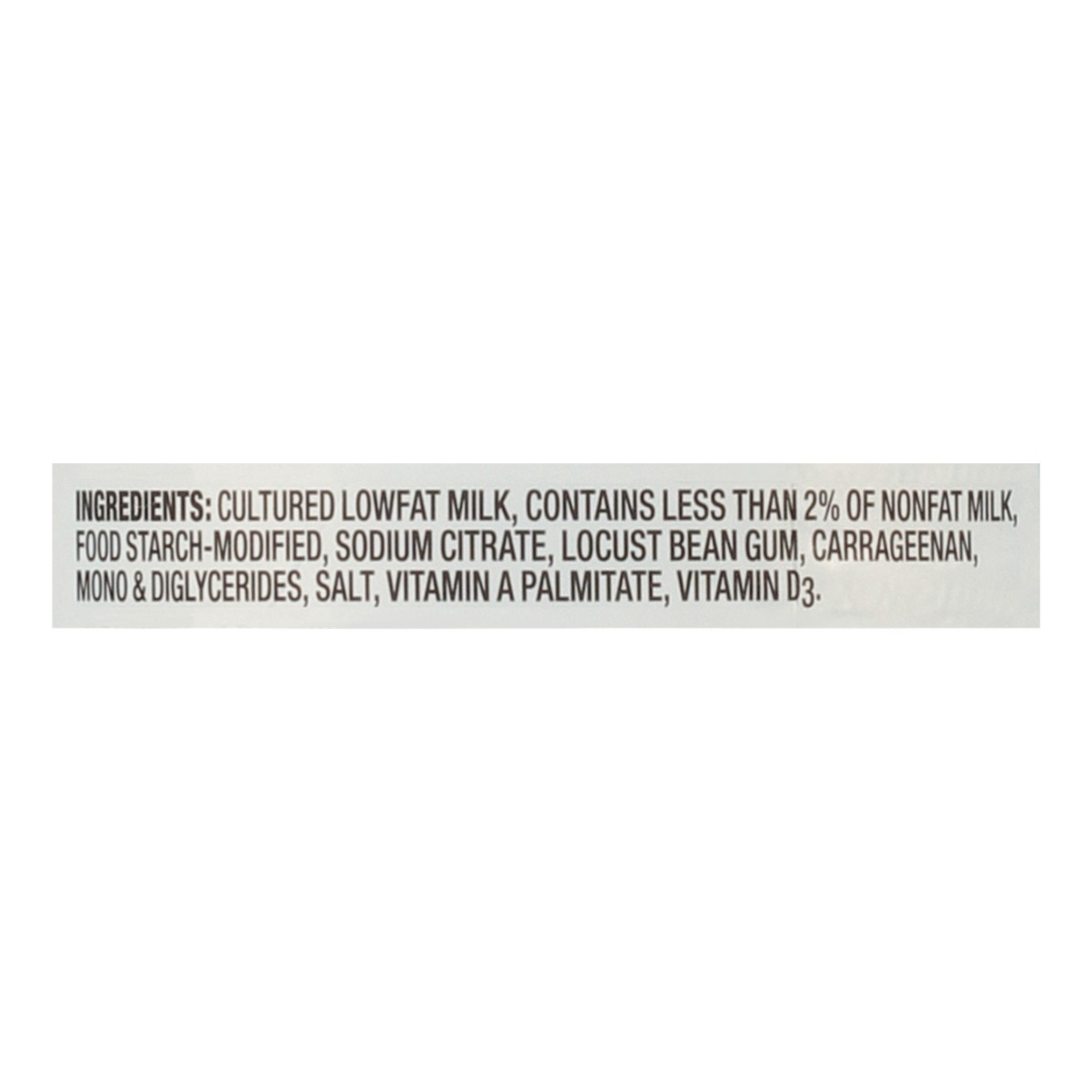 Ingredients: Cultured low fat milk, contains less than 2% of nonfat milk, food starch- modified, sodium citrate, locust bean gum, carrageenan, mono & diglycerides, salt, vitamin A palmitate, vitam…
