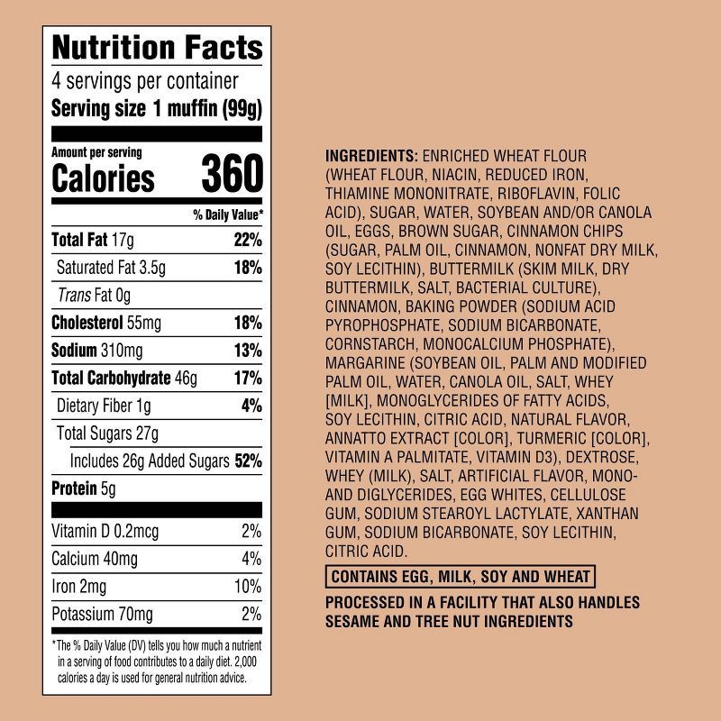 ENRICHED WHEAT FLOUR (WHEAT FLOUR, NIACIN, REDUCED IRON, THIAMINE MONONITRATE, RIBOFLAVIN, FOLIC ACID), SUGAR, WATER, SOYBEAN AND/OR CANOLA OIL, EGGS, BROWN SUGAR, CINNAMON CHIPS (SUGAR, PALM OIL, CIN…