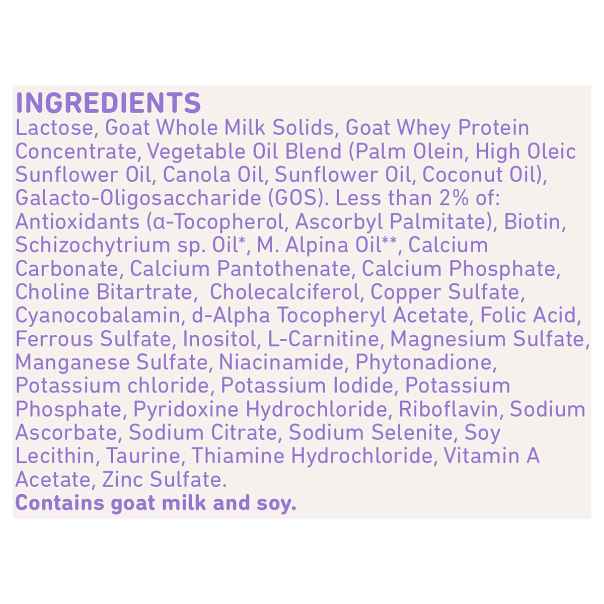 Lactose, Goat Whole Milk Solids, Goat Whey Protein Concentrate, Vegetable Oil Blend (Palm Olein, High Oleic Sunflower Oil, Canola Oil, Sunflower Oil, Coconut Oil), Galacto-Oligosaccharide (Gos), Less …