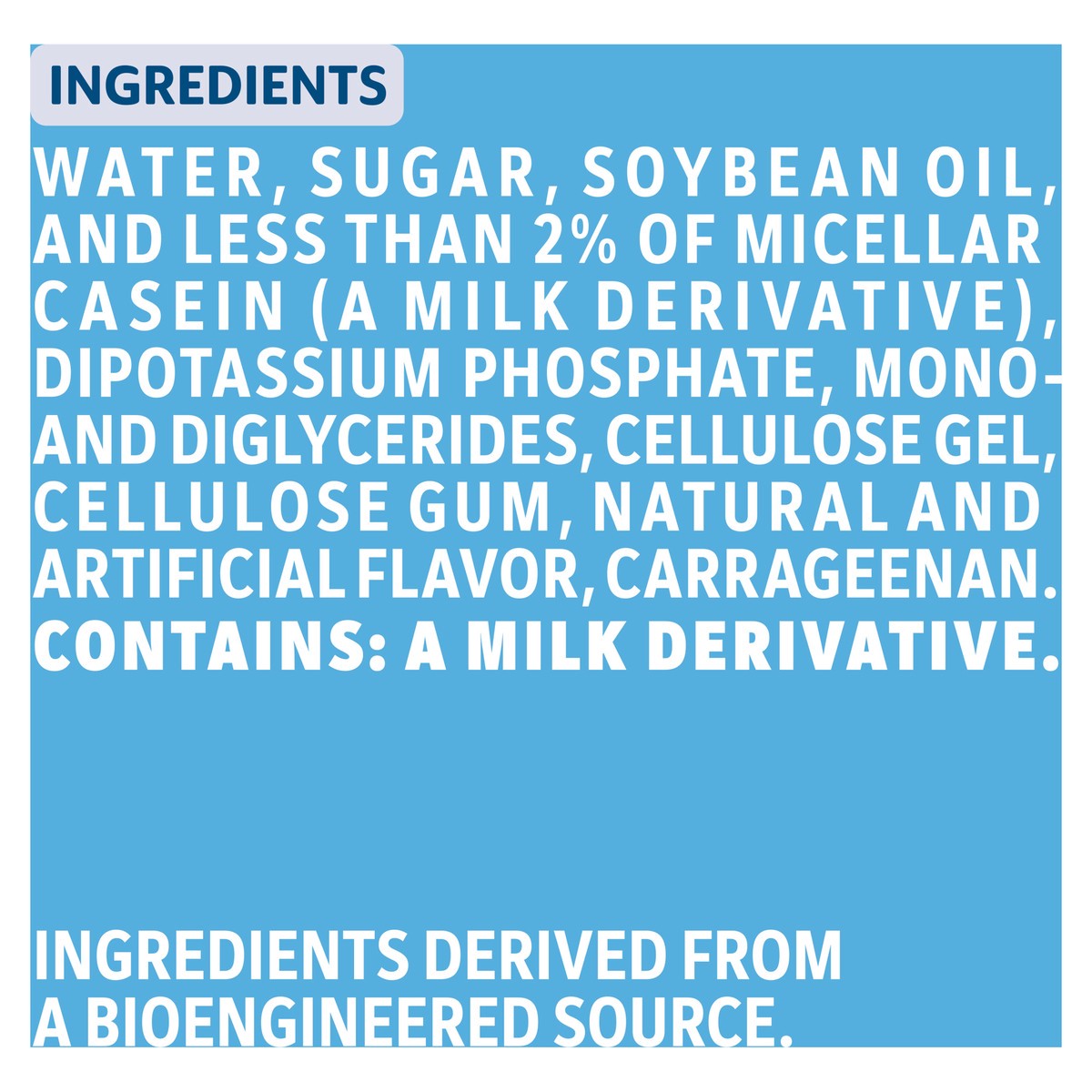 Water, Sugar, Soybean Oil, and Less than 2% of Micellar Casein (a Milk Derivative), Dipotassium Phosphate, Mono- and Diglycerides, Cellulose Gel, Cellulose Gum, Natural and Artificial Flavor, Carragee…