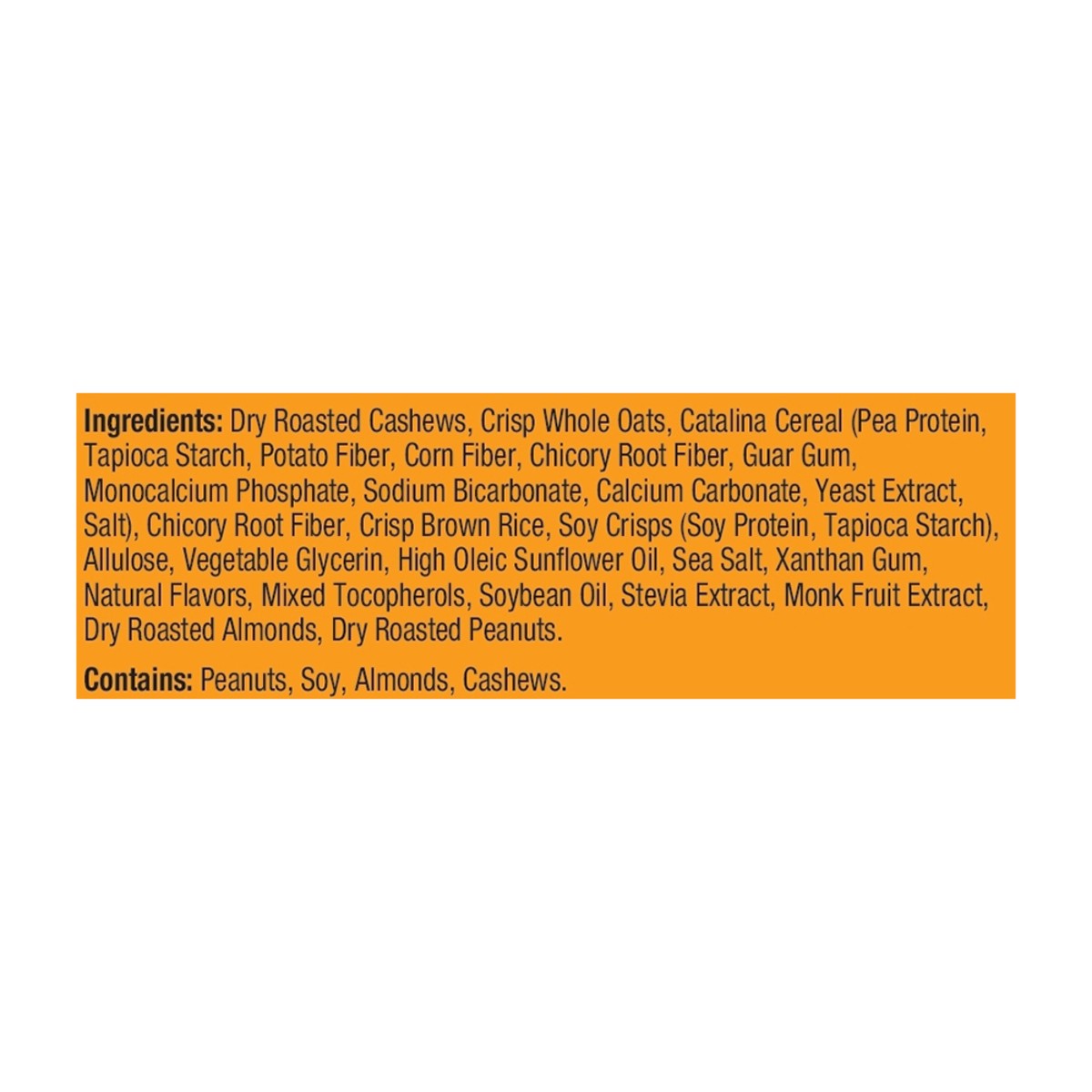 Dry Roasted Cashews, Crisp Whole Oats, Catalina Cereal (Pea Protein, Tapioca Starch, Potato Fiber, Corn Fiber, Chicory Root Fiber, Guar Gum, Monocalcium Phosphate, Sodium Bicarbonate, Calcium Carbonat…