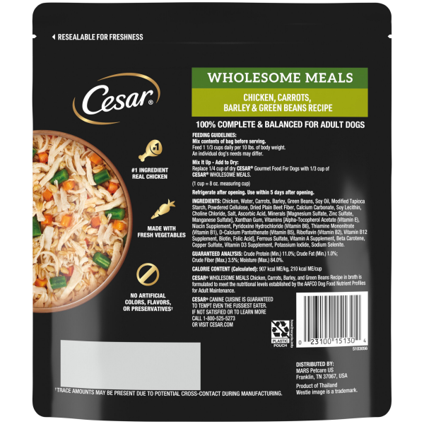 Calorie Content (Calculated): 907 kcal ME/kg, 210 kcal ME/cup Cesar Wholesome Meals Chicken, Carrots, Barley, and Green Beans Recipe in broth is formulated to meet the nutritional levels established b…