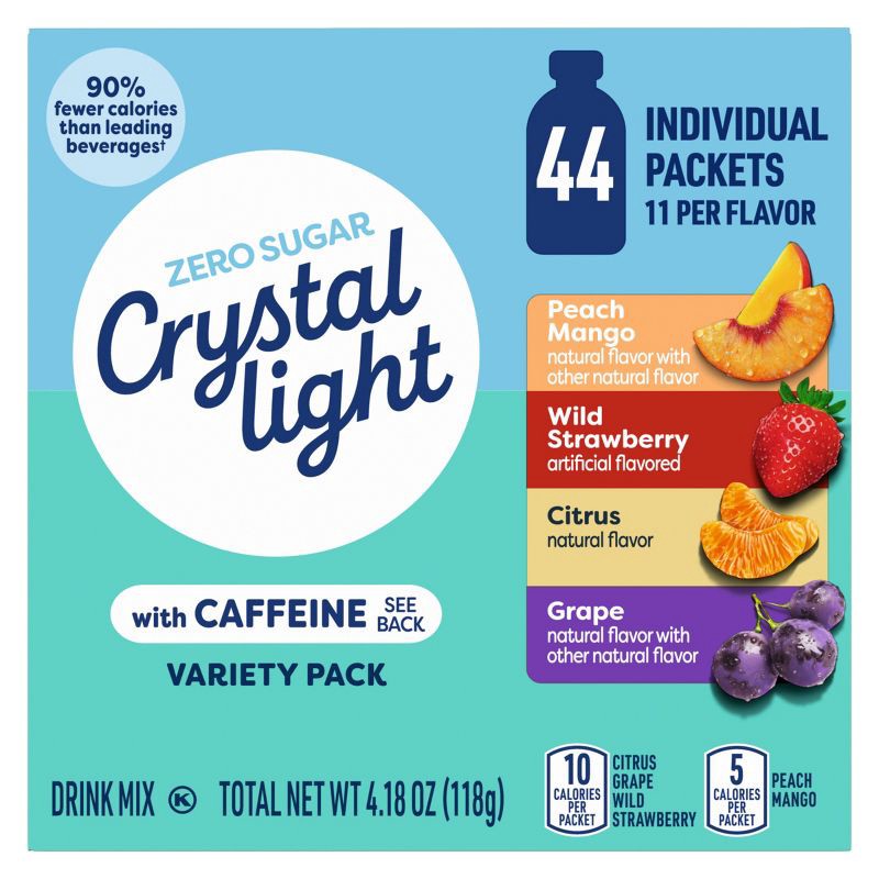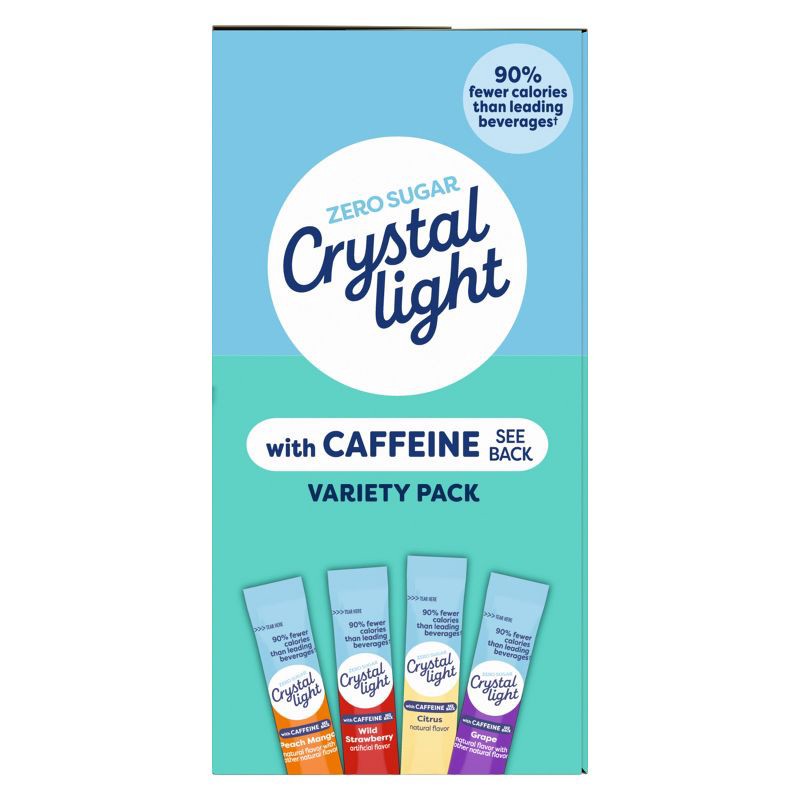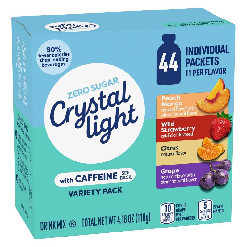 - DRINK PACKETS: One 4.18 oz variety pack of Crystal Light Energizing On-the-Go Powdered Drink Mix with Caffeine that contains 11 packets of each flavor: Peach Mango, Wild Strawberry, Citrus and Grape