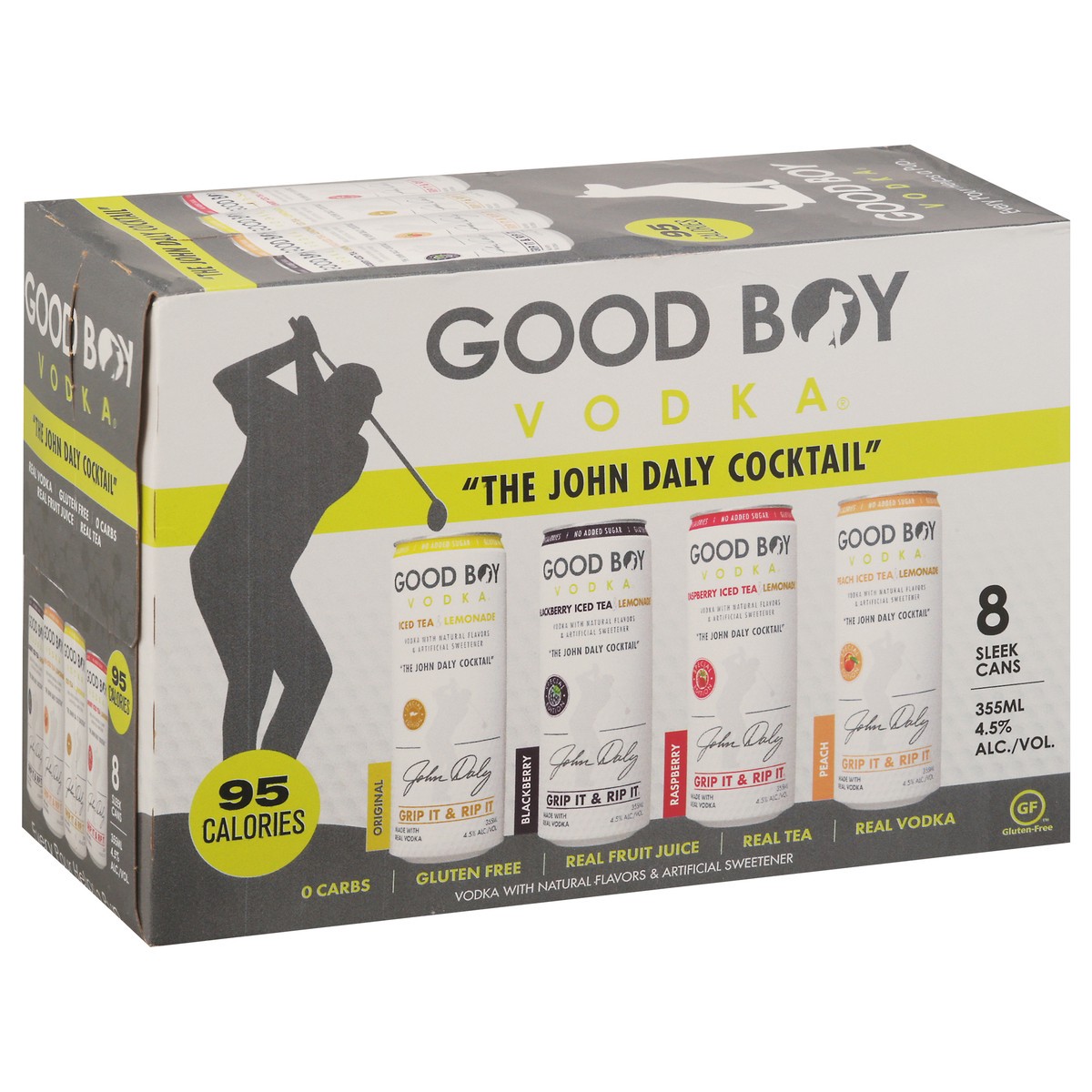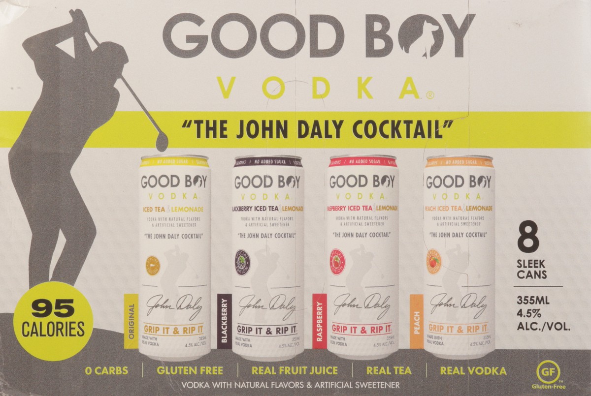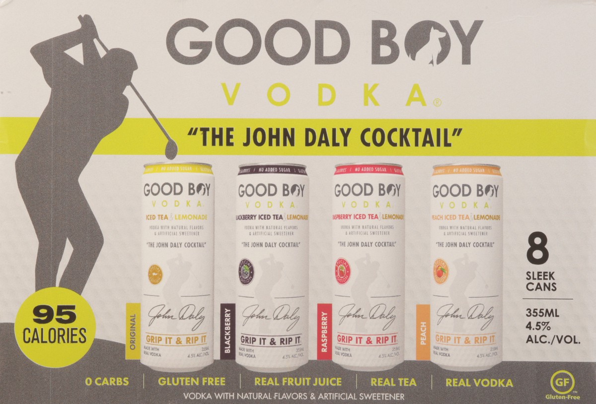 United States - The John Daly cocktail is an exclusive and delicious drink handcrafted by Good Boy vodka. It is an iced tea, lemonade, and vodka. The variety pack contains Blackberry, Raspberry, and P…