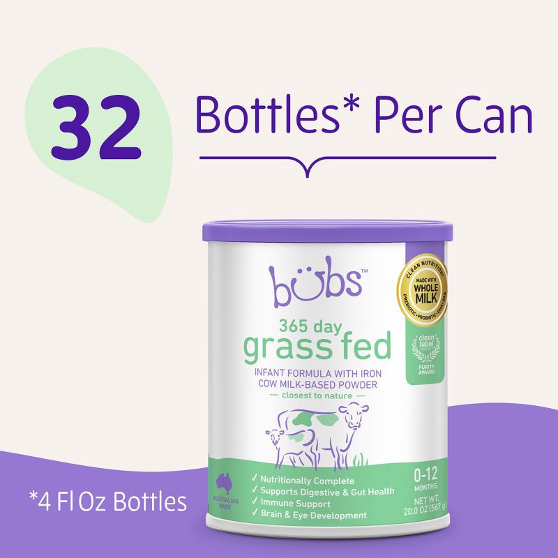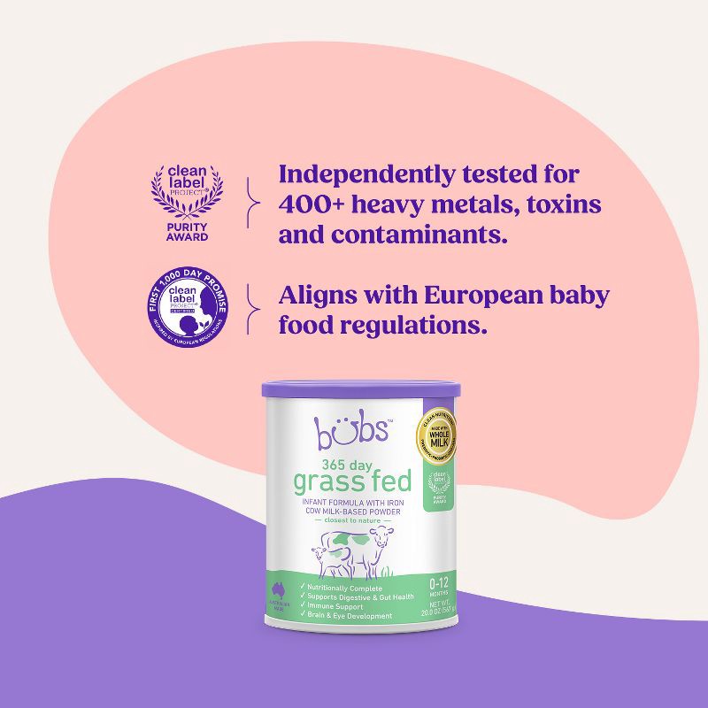 - GOODNESS FROM THE FARM: Bubs 365 Day Grass Fed Infant Formula is securely blended and made with whole milk. No GMOs, corn syrup, artificial colors, flavors or preservatives. Clean Label Project Purity Award & First 1,000 Days Promise standards