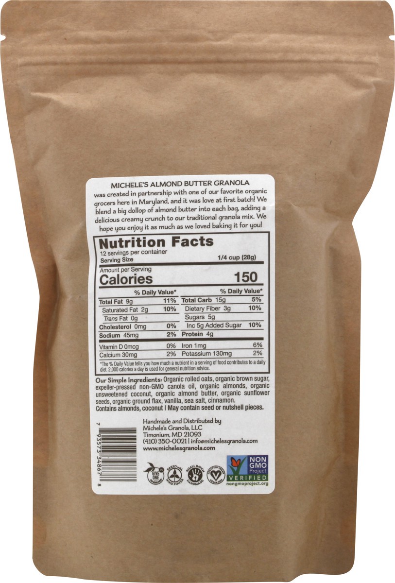 Organic Rolled Oats, Organic Brown Sugar, Expeller-Pressed Non-GMO Canola Oil, Organic Almonds, Organic Unsweetened Coconut, Organic Almond Butter, Organic Sunflower Seeds, Organic Ground Flax, Vanill…