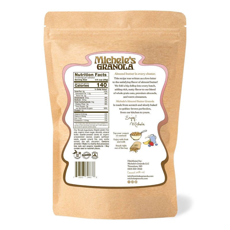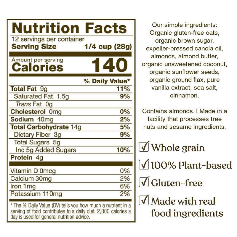 Organic Gluten-Free Oats, Organic Brown Sugar, Expeller-Pressed Canola Oil, Almonds, Almond Butter, Organic Unsweetened Coconut, Organic Sunflower Seeds, Organic Ground Flax, Pure Vanilla Extract, Sea…