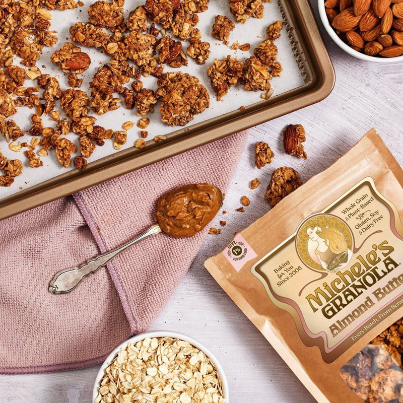 Our Almond Butter Granola is a hearty blend of organic gluten-free oats, creamy almond butter, whole and sliced almonds, and warm cinnamon. We fold a big dollop of almond butter into every batch, addi…