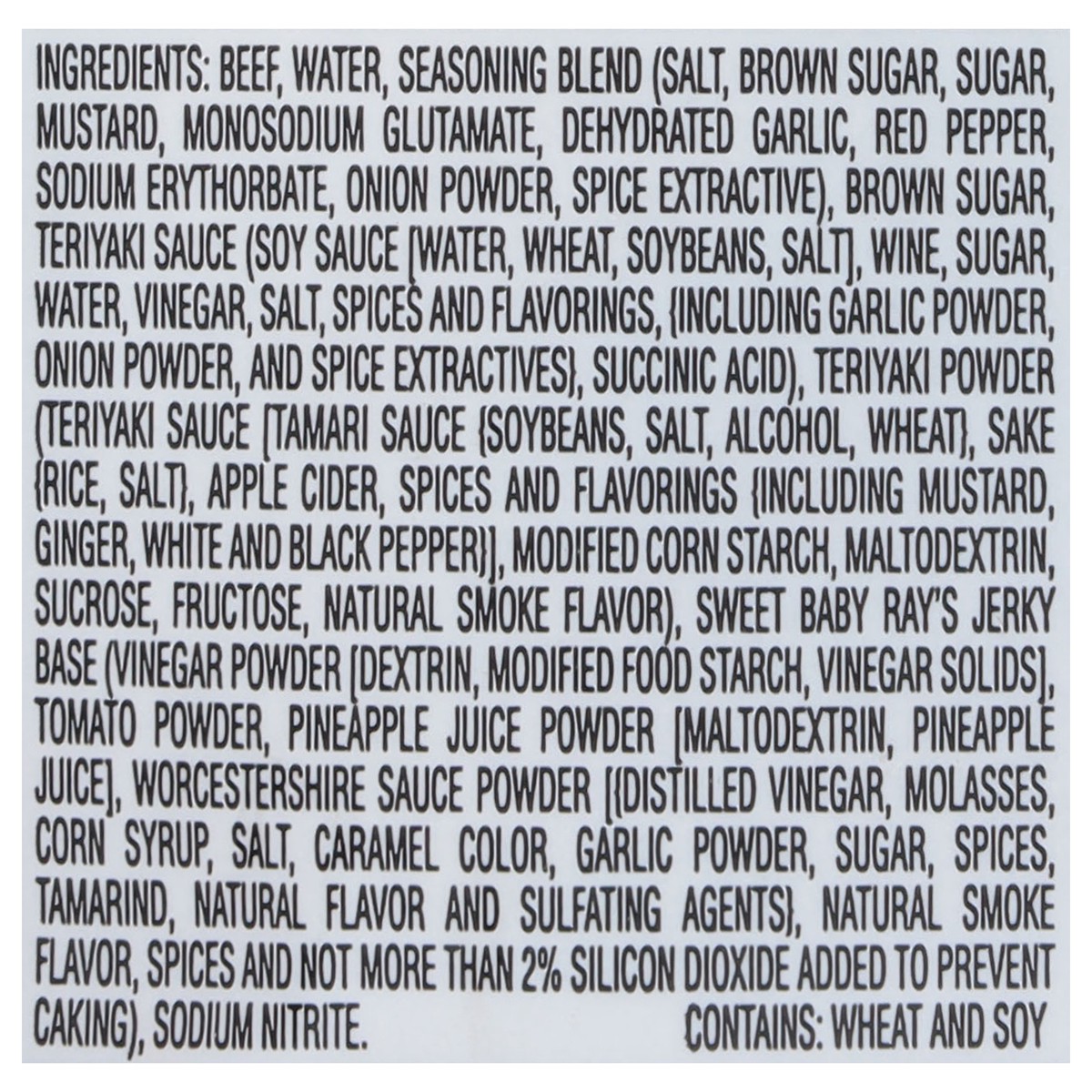 Beef, Water, Seasoning Blend (Salt, Brown Sugar, Sugar, Mustard, Monosodium Glutamate, Dehydrated Garlic, Red Pepper, Sodium Erythorbate, Onion Powder, Spice Extractive), Brown Sugar, Teriyaki Sauce (…