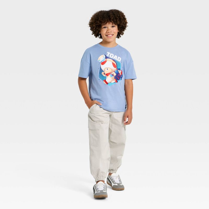 Power up your child's casual wardrobe with this Nintendo Super Mario Brothers Short-Sleeve Toad Let's Go Oversized Graphic T-Shirt. This light blue T-shirt features a colorful front illustration of To…
