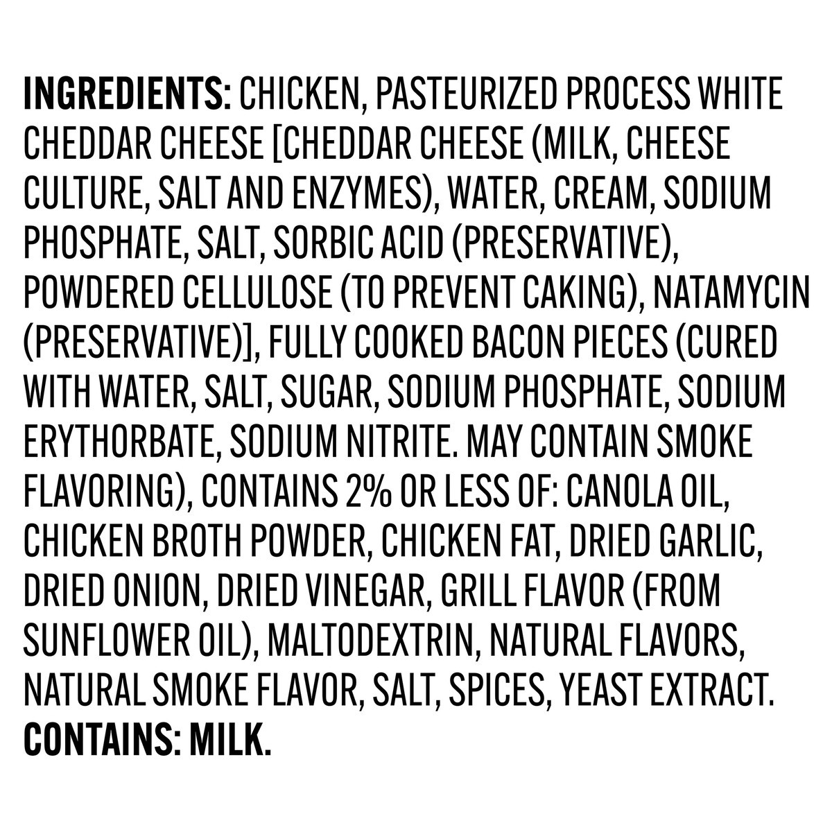 Chicken, Pasteurized Process White Cheddar Cheese [Cheddar Cheese (Milk, Cheese Culture, Salt and Enzymes), Water, Cream, Sodium Phosphate, Salt, Sorbic Acid (Preservative), Powdered Cellulose (to Pre…