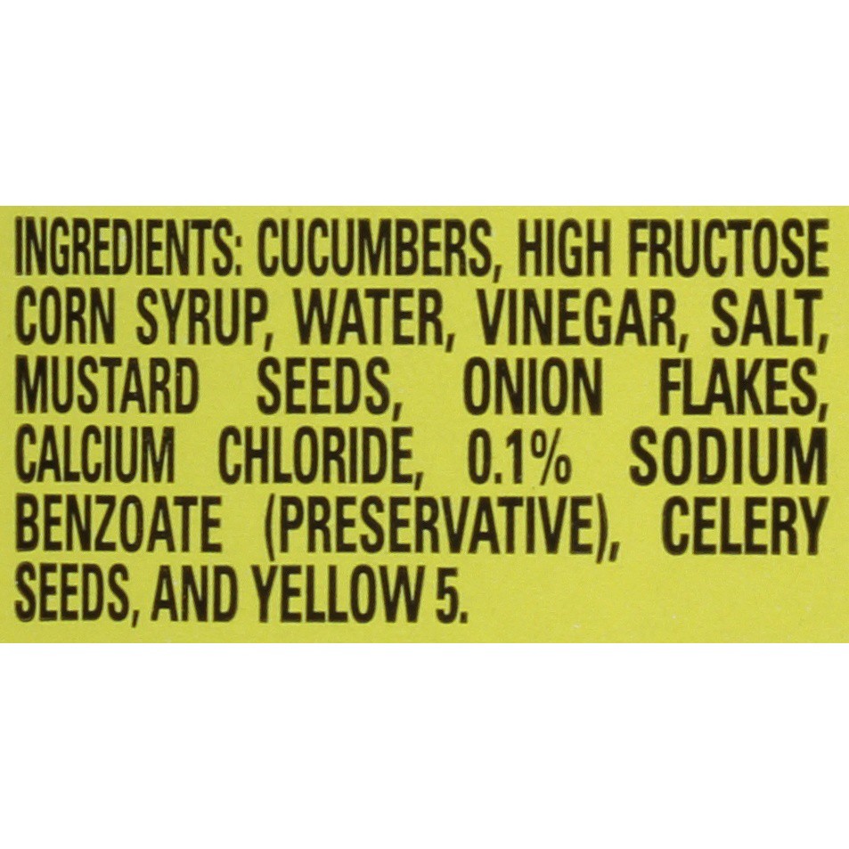 Cucumbers, High Fructose Corn Syrup, Water, Vinegar, Salt, Mustard Seeds, Onion Flakes, Calcium Chloride, 0.1% Sodium Benzoate (Preservative), Celery Seeds, and Yellow 5.