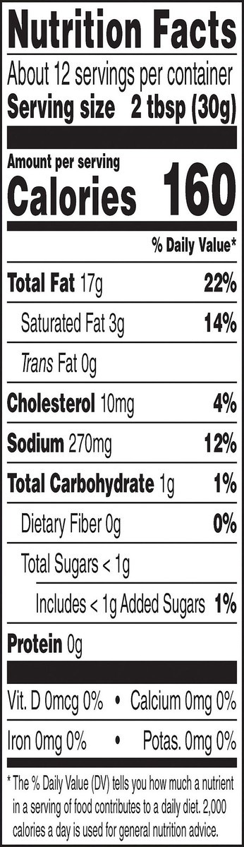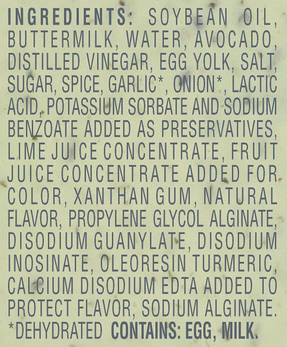 Soybean Oil, Buttermilk, Water, Avocado, Distilled Vinegar, Egg Yolk, Salt, Sugar, Spice, Garlic (Dehydrated), Onion (Dehydrated), Lactic Acid, Potassium Sorbate and Sodium Benzoate Added as Preservat…