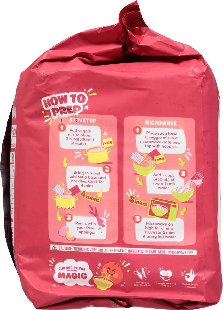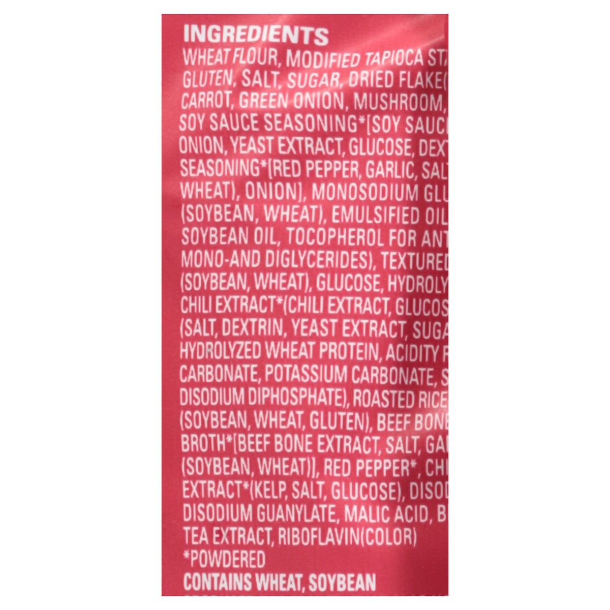Wheat Flour, Modified Tapioca Starch, Palm Oil, Wheat Gluten, Salt, Sugar, Dried Flake (Chinese Cabbage, Carrot, Green Onion, Mushroom, Red Pepper), Garlic*, Soy Sauce Seasoning* [Soy Sauce (Soybean, …