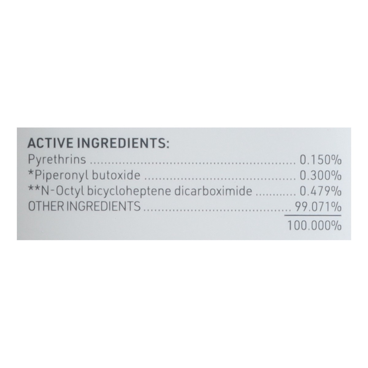 Active ingredients:nPyrethrins - 0.150%.n*Piperonyl Butoxide - 0.300%.n**N-Octyl Bicycloheptene Dicarboximide - 0.479%.nOther ingredients - 99.071%.n100.000%.