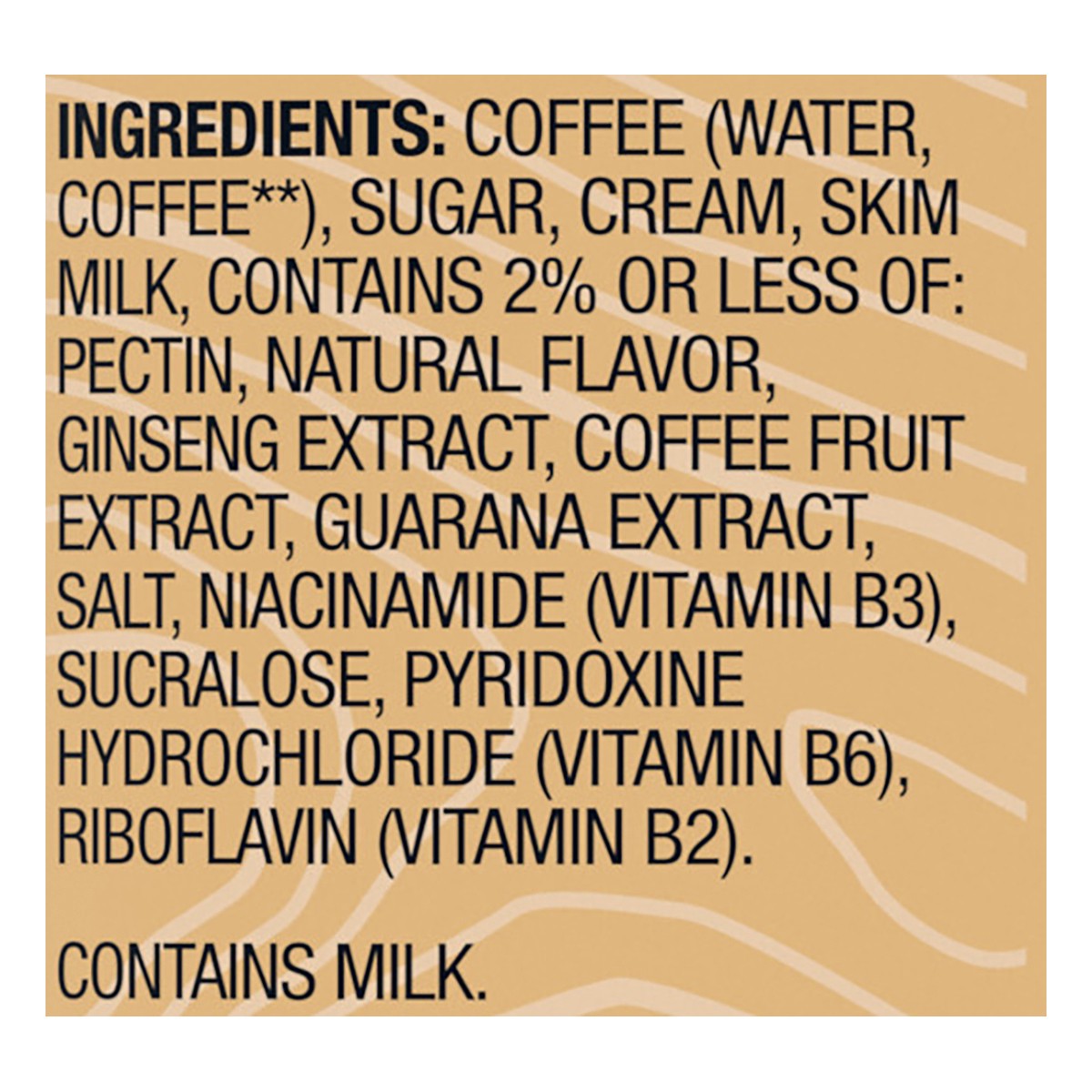 Coffee (Water, Coffee**), Sugar, Cream, Skim Milk, Contains 2% or Less of: Pectin, Natural Flavor, Ginseng Extract, Coffee Fruit Extract, Guarana Extract, Salt, Niacinamide (Vitamin B3), Sucralose, Py…