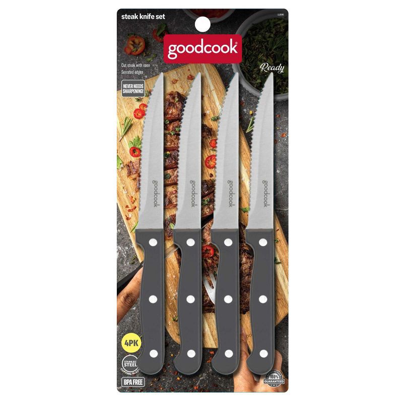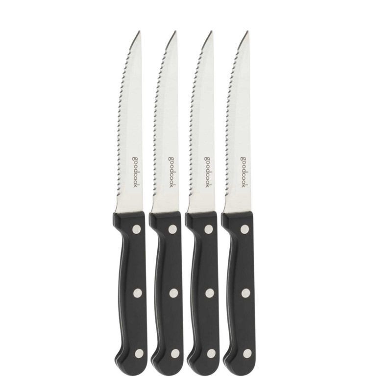 Our GoodCook 4pc. Steak Knife set features serrated edges that help cut effortlessly through steaks, chops and other meats. The blade is built for strength and balance with a full tang, secured by 3 r…