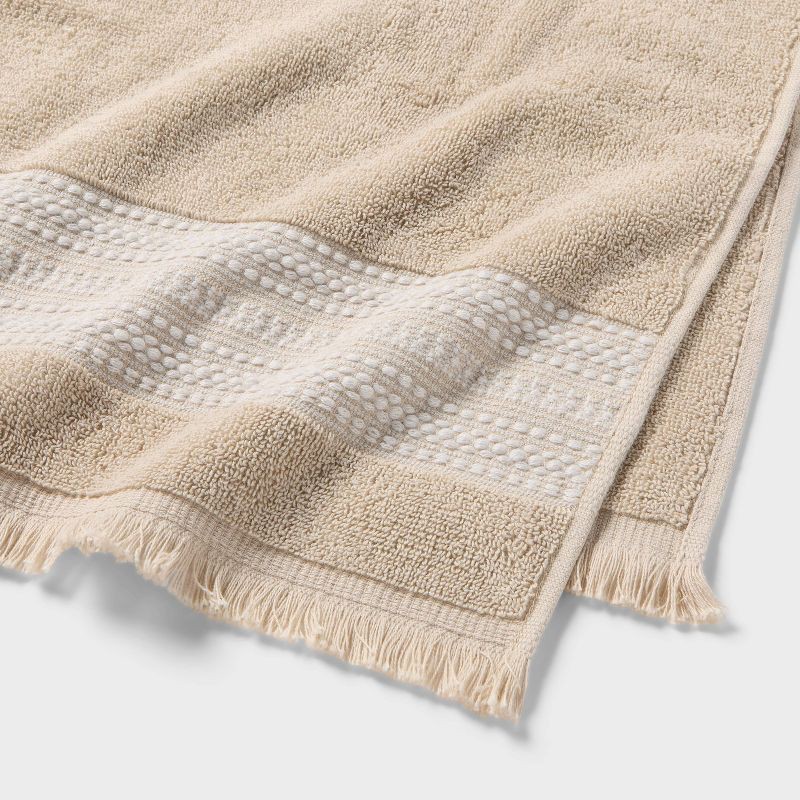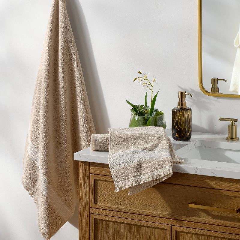 Dress up your home for July 4th celebrations with these 2-Pack Americana Striped Towels from Threshold™. These tan-colored bath towels feature white textural stripes on dobby border accentuated by fri…