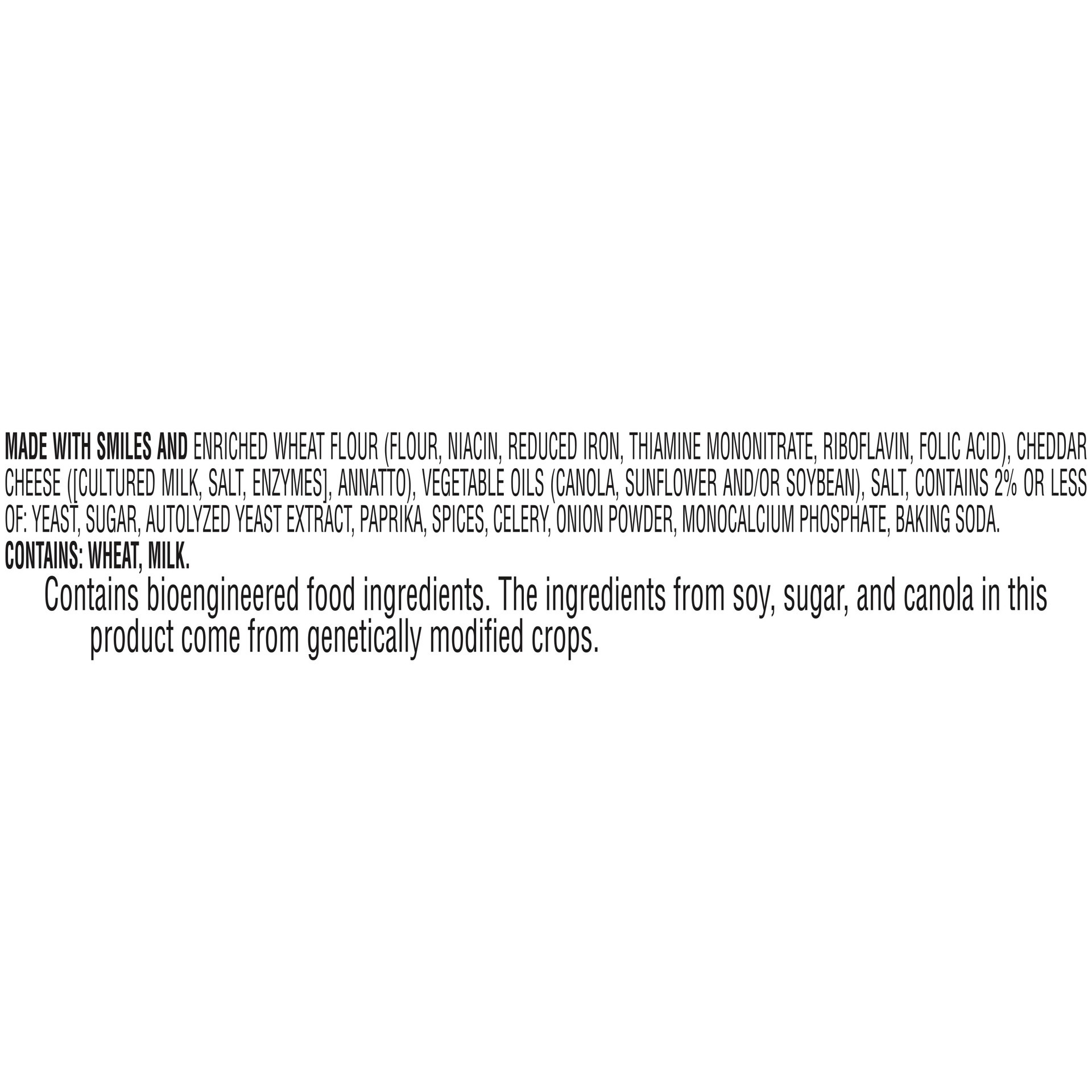 MADE WITH SMILES AND ENRICHED WHEAT FLOUR (FLOUR, NIACIN, REDUCED IRON, THIAMINE MONONITRATE, RIBOFLAVIN, FOLIC ACID), CHEDDAR CHEESE ([CULTURED MILK, SALT, ENZYMES], ANNATTO), VEGETABLE OILS (CANOLA,…