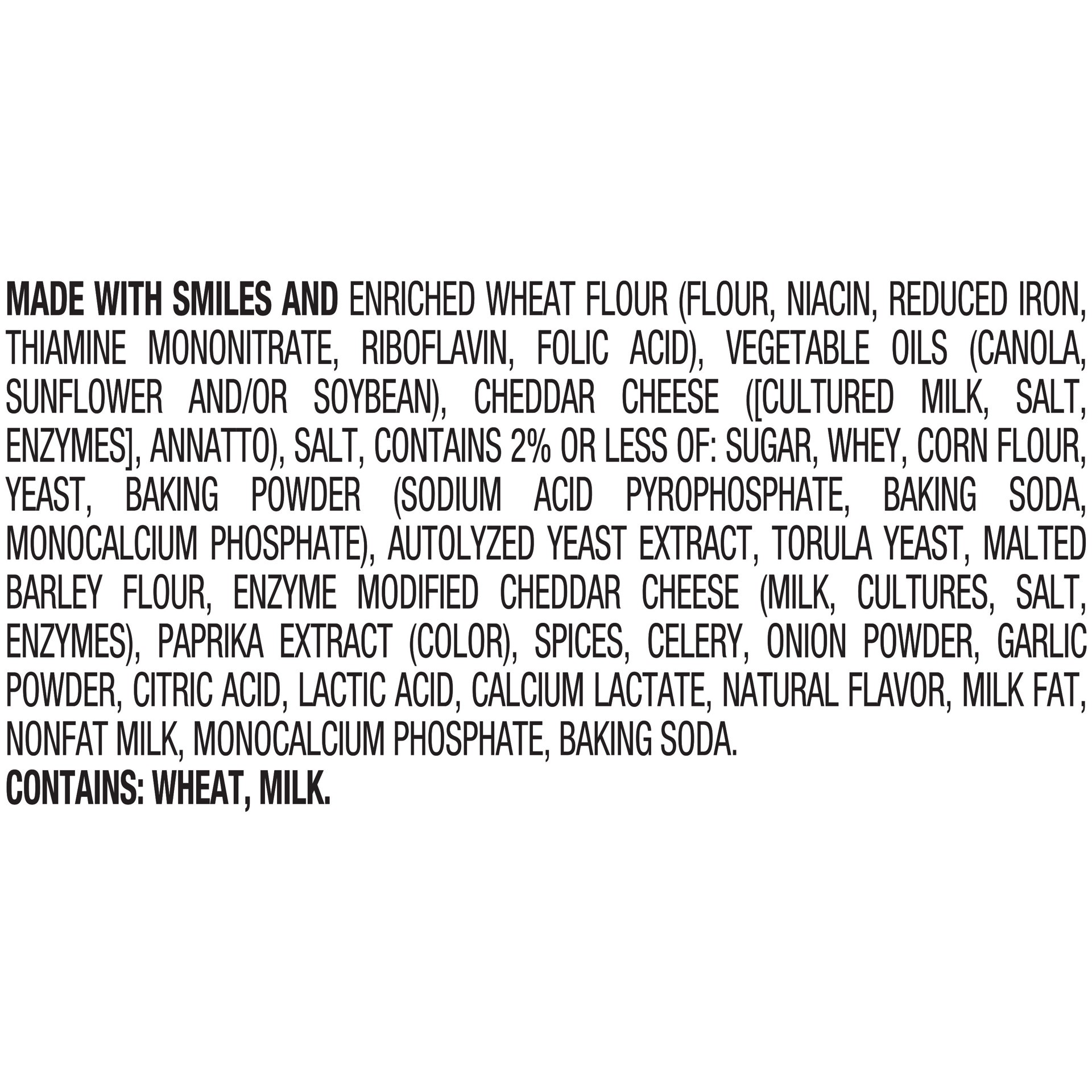 MADE WITH SMILES AND ENRICHED WHEAT FLOUR (FLOUR, NIACIN, REDUCED IRON, THIAMINE MONONITRATE, RIBOFLAVIN, FOLIC ACID), VEGETABLE OILS (CANOLA, SUNFLOWER AND/OR SOYBEAN), CHEDDAR CHEESE ([CULTURED MILK…