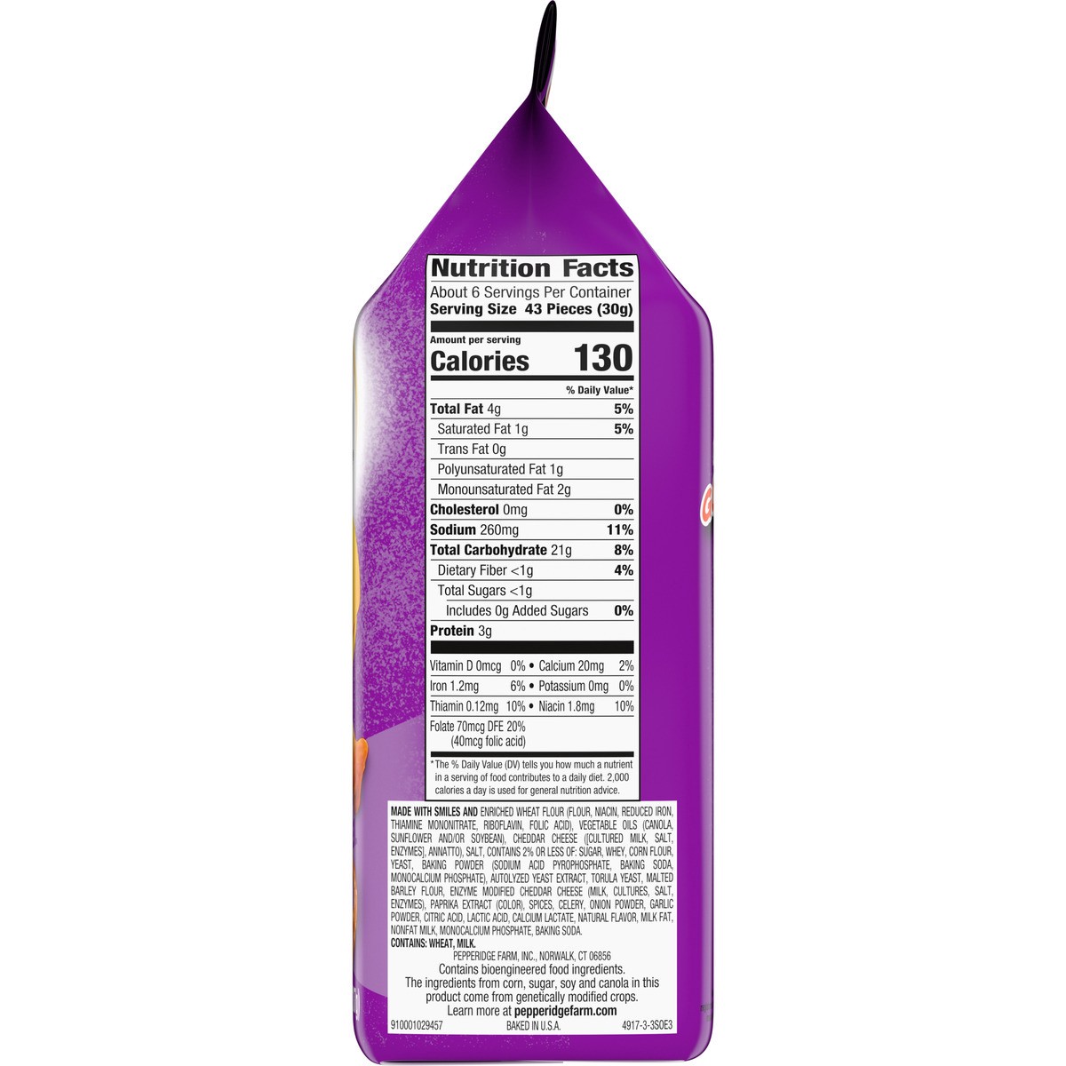 MADE WITH SMILES AND ENRICHED WHEAT FLOUR (FLOUR, NIACIN, REDUCED IRON, THIAMINE MONONITRATE, RIBOFLAVIN, FOLIC ACID), VEGETABLE OILS (CANOLA, SUNFLOWER AND/OR SOYBEAN), CHEDDAR CHEESE ([CULTURED MILK…