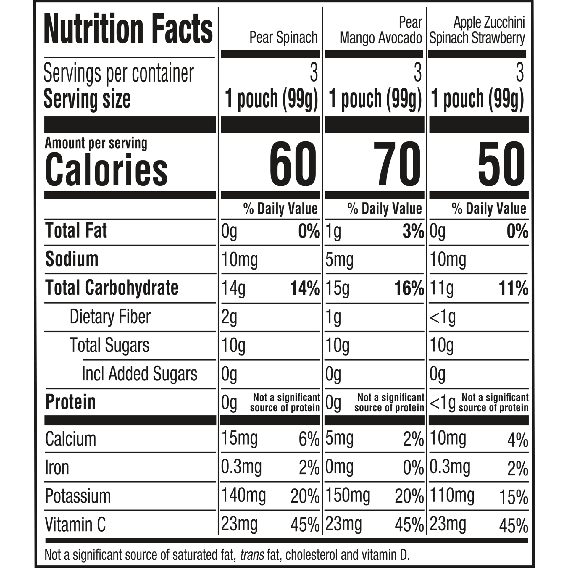 Pear Spinach: Organic Pears, Organic Spinach, Vitamin C (Ascorbic Acid), Organic Lemon Juice Concentrate. Apple Carrot Squash : Organic Apples, Organic Carrots, Organic Butternut Squash, Water, Organi…