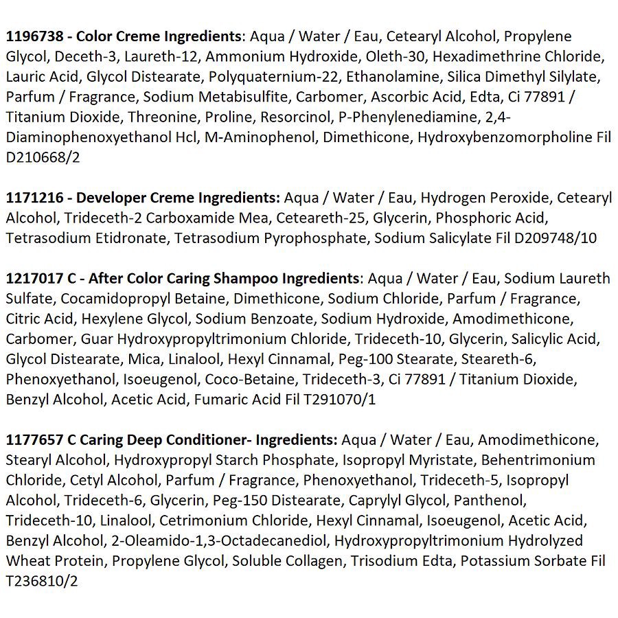Pre-Color Serum: 1087196C: Aqua/Water, Cetearyl Alcohol, Glycerin, Trideceth-2 Carboxamide MEA, Ceteareth-25, Fragrance, Hexadimethrine Chloride, Polyquaternium-22, Pentasodium Pentetate, Hydrolyzed O…